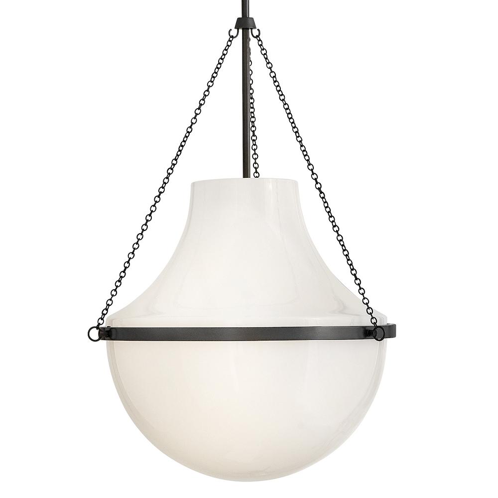 Fusing a sculpted, modern form with classically styled details, Collins features a transitional teardrop shade crafted from blown, cased opal glass. A central metal band and delicate chain uprights are available in Heritage Brass or Black Oxide finishes.
