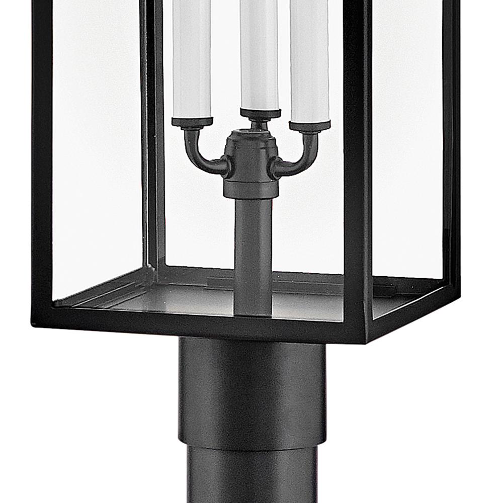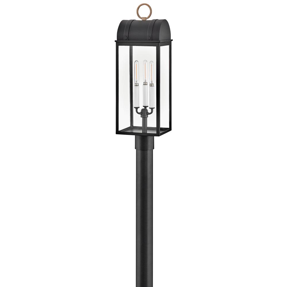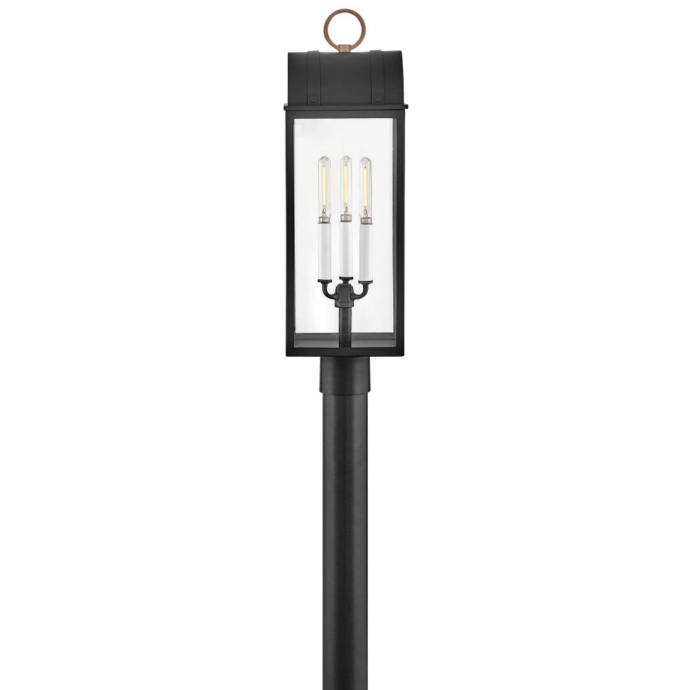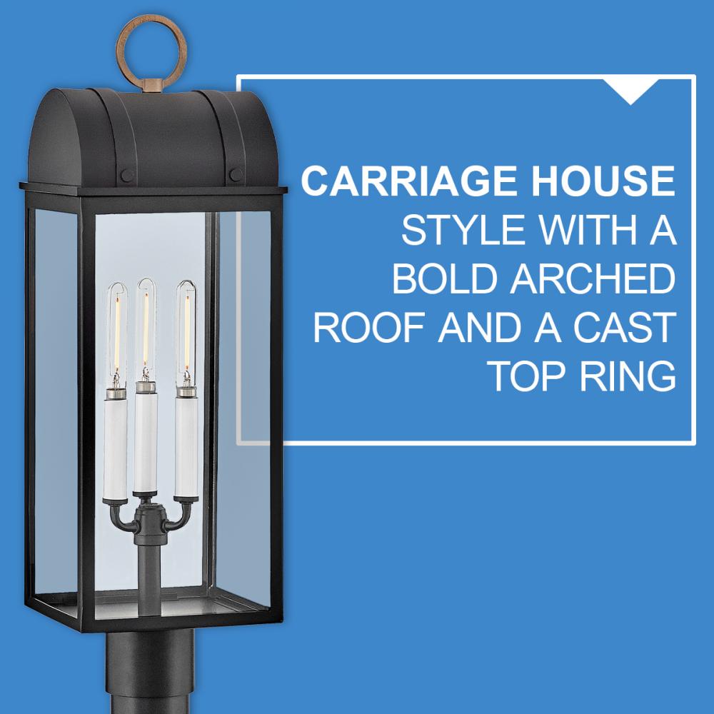 Inspired by traditional colonial lanterns, Campbell’s carriage house styling complements classic architecture accentuated by a bold arched roof and a cast top ring. Candelabra lamps with contrasting candle sleeves are enhanced by a Black with Burnished Bronze finish.