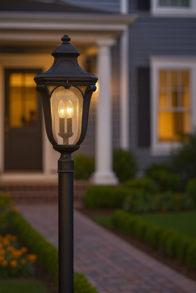 Trafalgar’s grand design in sturdy cast aluminum adds historical flair with delicate scroll arch detail, authentic distressed finish and clear seedy glass.