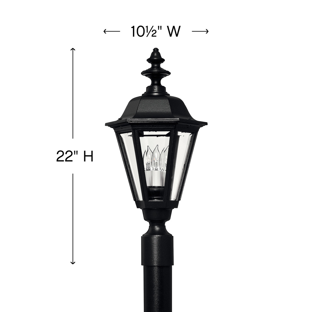 Manor House is a classic lantern design featuring durable cast aluminum, clear beveled glass panels and a bold Black finish. Select-A-Lite options come standard with both candelabra and medium based sockets.
