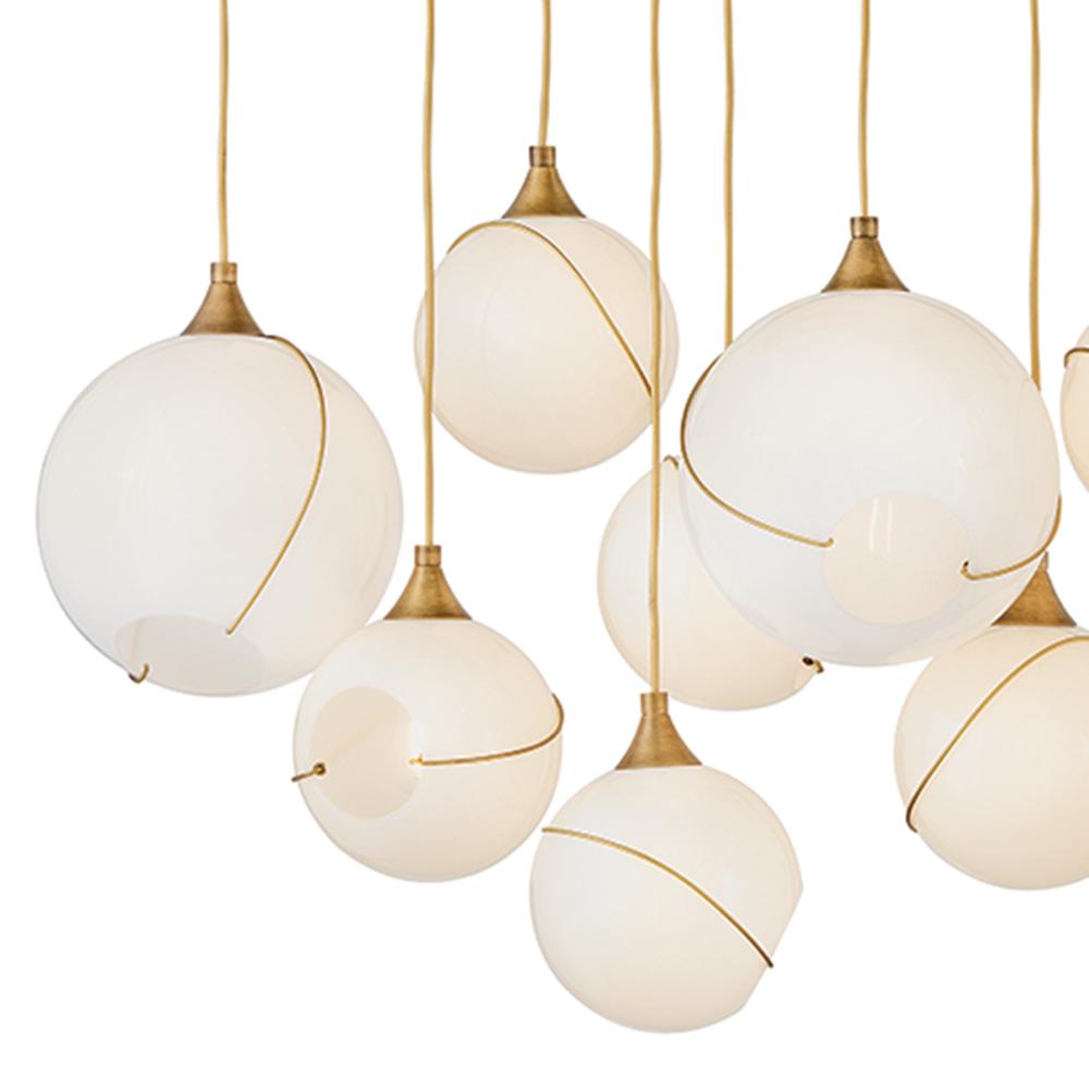 Mesmerizingly asymmetrical with a bohemian, mid-century modern flair, Skye showcases stunning globes of clear or cased opal glass with off-center openings. Slender rings and delicate details in Heritage Brass or Black finishes pull the look together, while adjustable wires allow you to create the perfect look for your space.