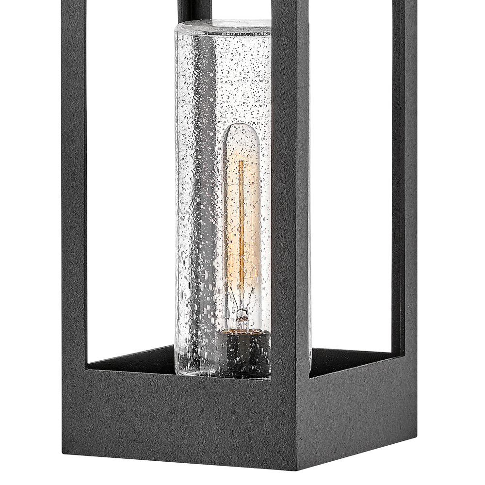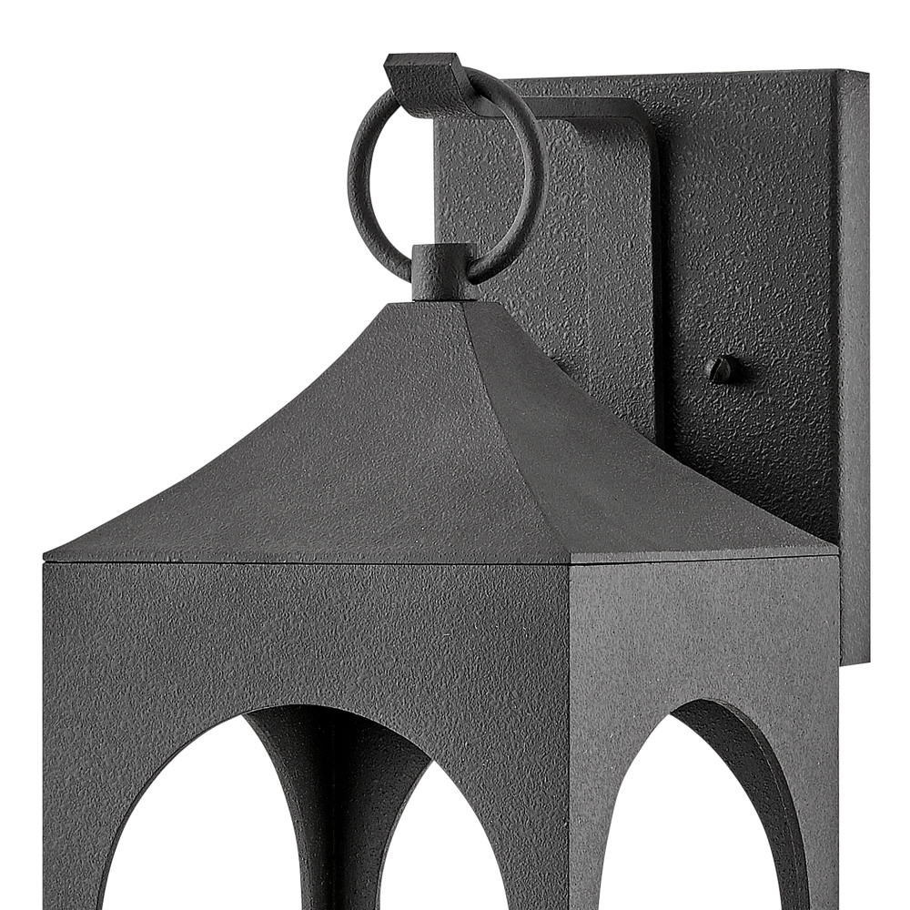 Amina is tradition with a flair. This lantern-inspired design features dramatic, arched windows revealing a seedy glass that creates a faux candle effect. Constructed of durable aluminum in a Distressed Zinc finish, Amina is complete with an oversized loop reinforcing its timeless appeal.