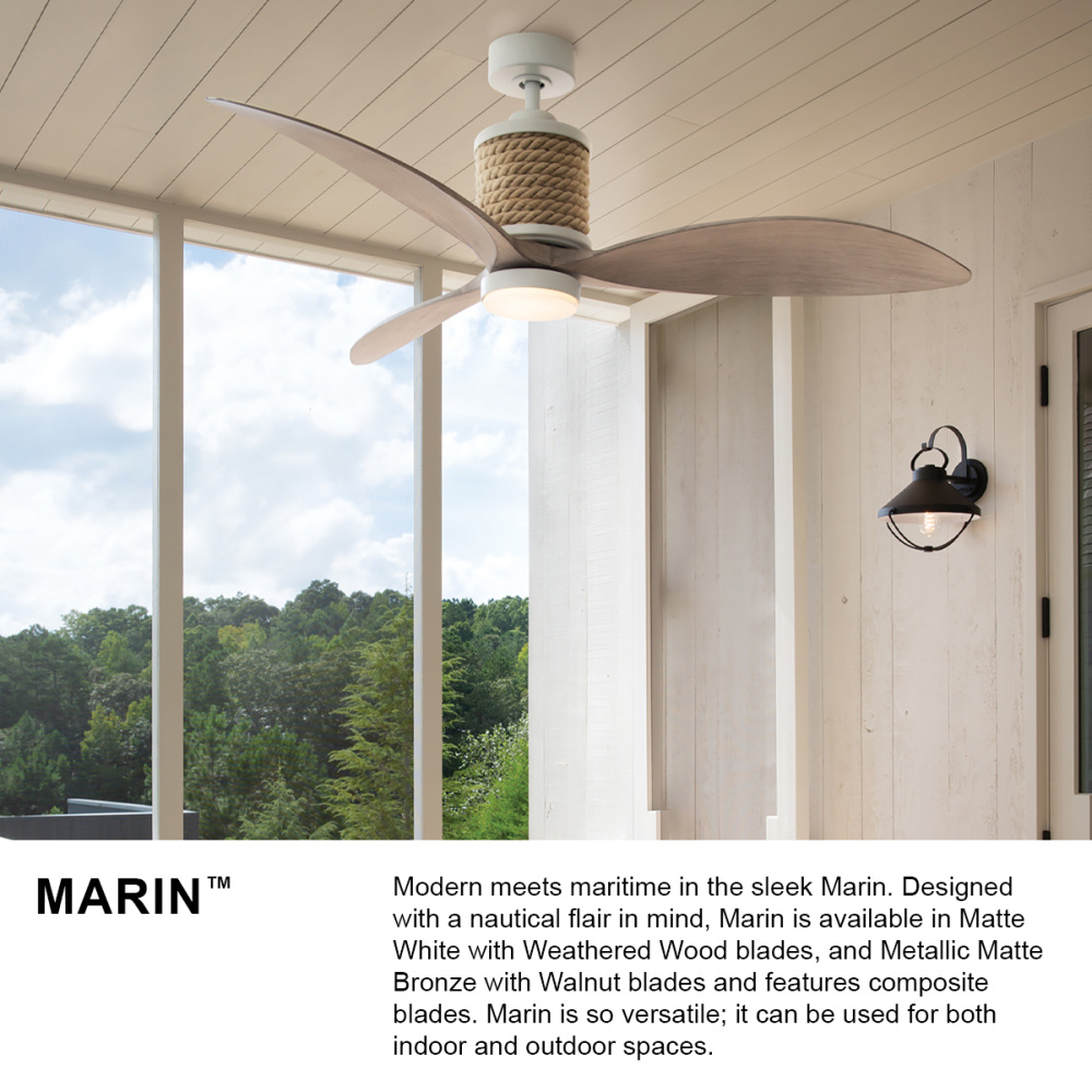 Modern meets maritime in the sleek Marin. Designed with a nautical flair in mind, Marin is available in Matte White, Metallic Matte Bronze, and Matte Black finishes and features composite blades. Marin is so versatile; it can be used for both indoor and outdoor spaces.