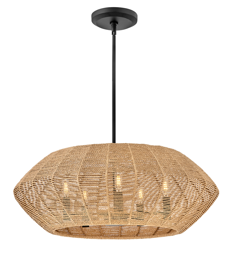 Luca's coastal vibe is permeated with a slightly exotic edge. The bold pendant showcases a robust, woven drum shade, and a full finished cluster for plenty of functional light offered in a variety of finish options. Luca is part of the Lisa McDennon Collection.
