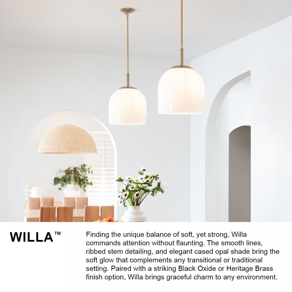 Finding the unique balance of soft, yet strong, Willa commands attention without flaunting. The smooth lines, ribbed stem detailing, and elegant cased opal shade bring the soft glow that complements any transitional or traditional setting. Paired with a striking Black Oxide or Heritage Brass finish option, Willa brings graceful charm to any environment.