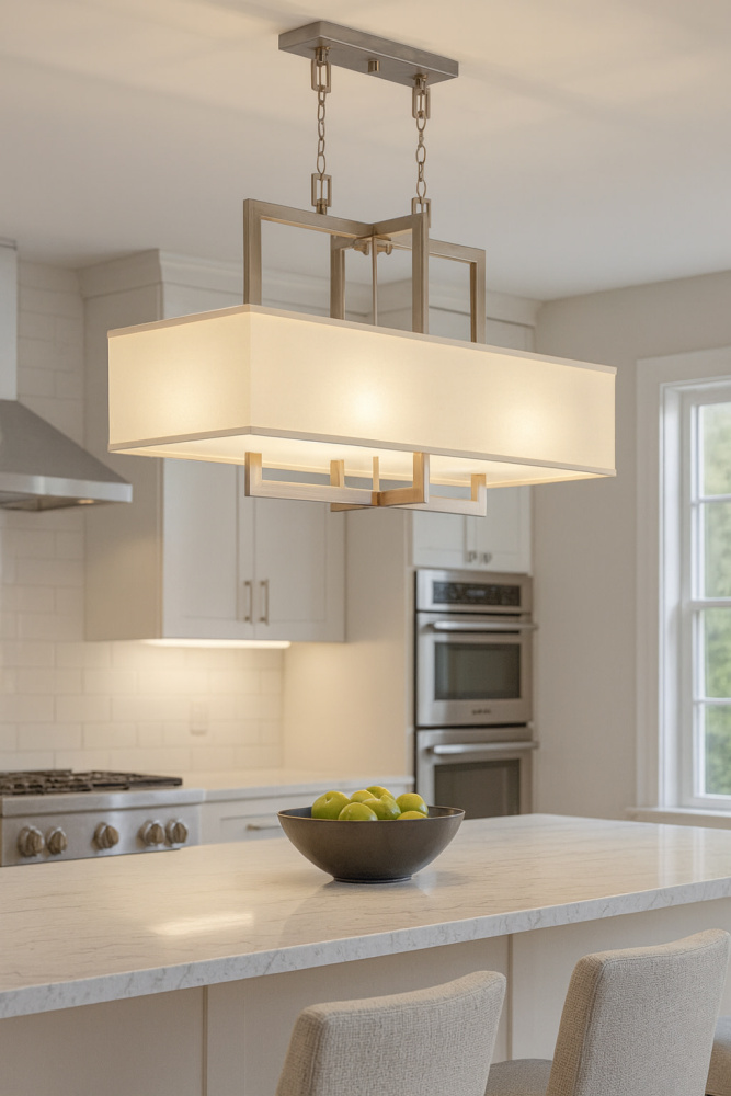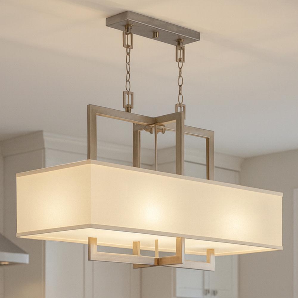 Hampton is a modern transitional design, offering the ultimate in urban sophistication. The minimal, rectangular frame is softened by a contemporary off-white linen drum shade.