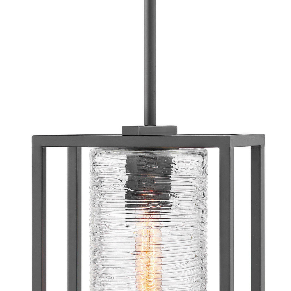 The Pax lantern features a stunning clear, spun glass cylinder as a dramatic focal point, with its bold linear shape enclosed in a sleek geometric frame. Pairing the modern minimalist design with an elongated vintage T-bulb is recommended to fully illuminate the glass and complement the overall aesthetic.