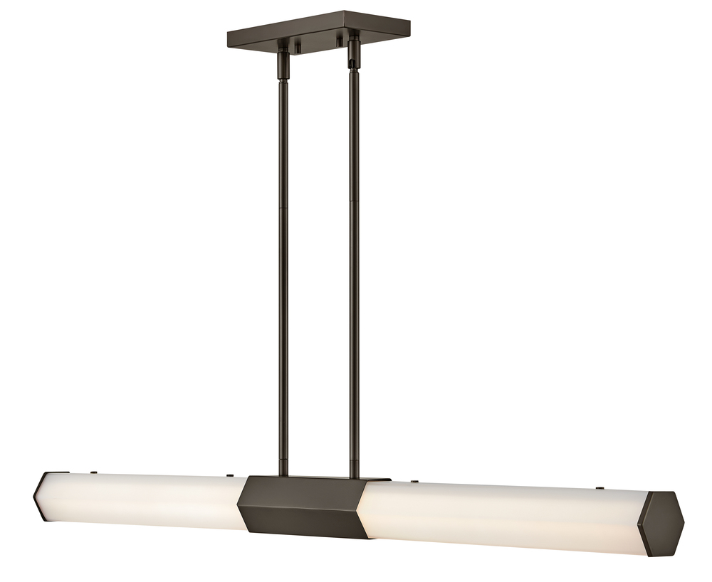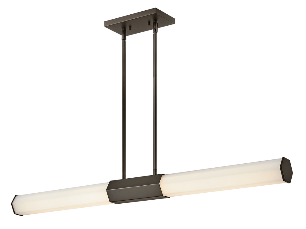 For a profile that is unpretentious, yet unforgettable, view all the sides of Facet. Interesting angles combine with a bold center bracelet to create the edgy and contemporary look. Hexagonal etched glass is highlighted by a Black Oxide or Heritage Brass center and end caps of the same shape, while the hidden mounting hardware remains unseen to simply highlight the superior style.
