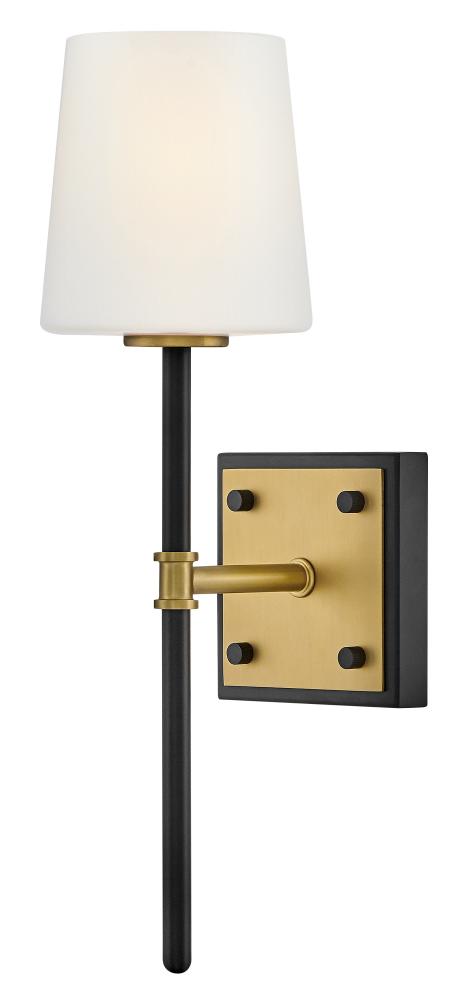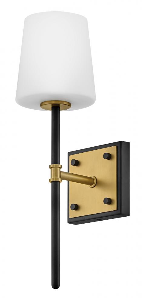 Saunders boasts a striking yet effortless appeal, blending traditional elements with captivating, mid-century modern details. A spoked silhouette and decorative stem holders are finished in Black and Lacquered Brass, paired with blown, etched opal glass shades.