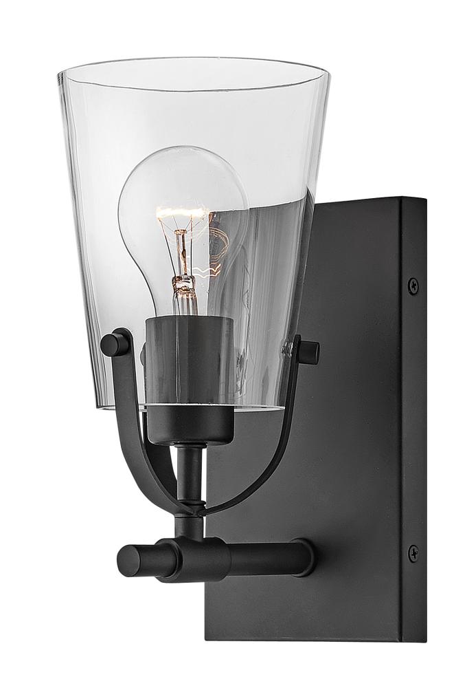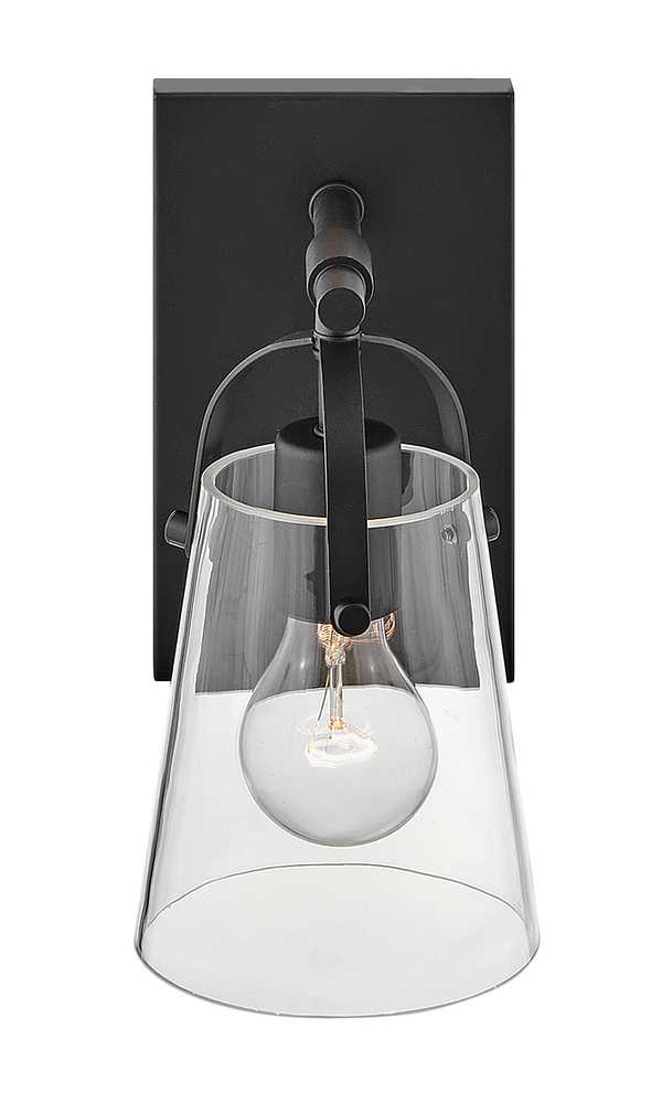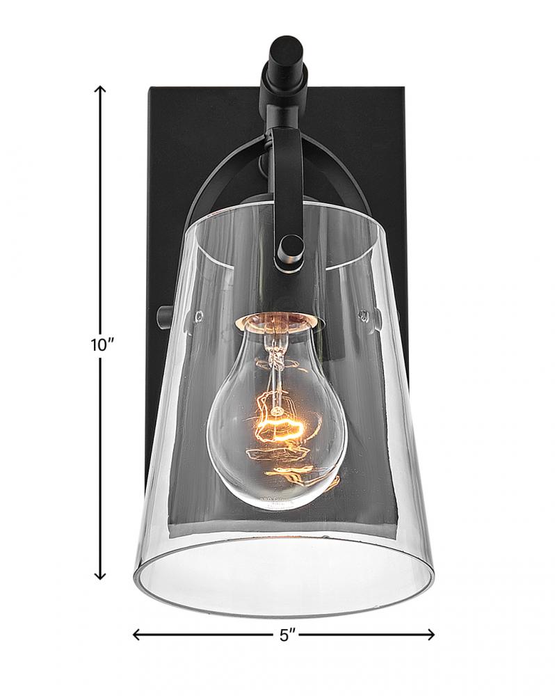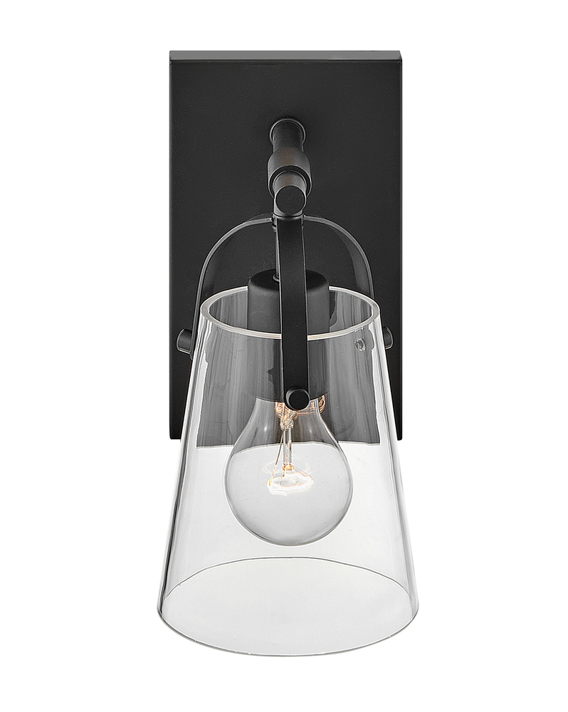Clean and airy, Foster breathes composed simplicity into any bath space. Its softly tapered glass shade, suspended from arched handle prongs, creates a sophisticated transitional silhouette, enhanced by practical yet stylized details.