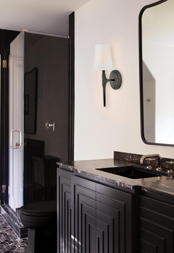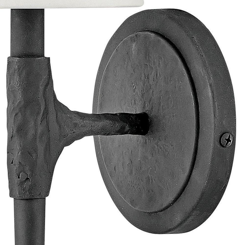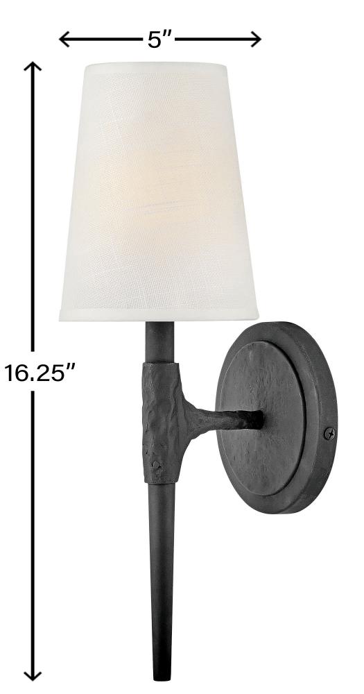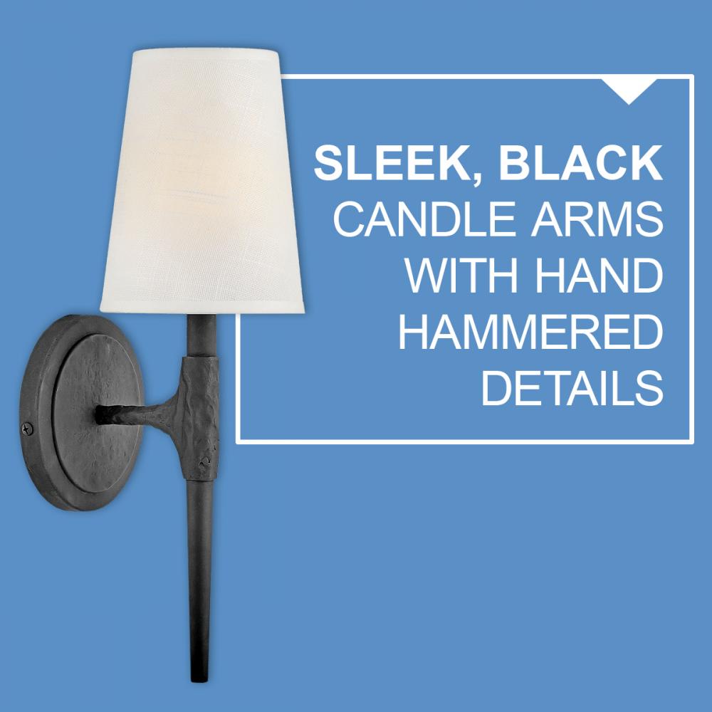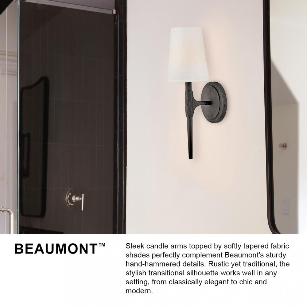 Sleek candle arms topped by softly tapered fabric shades perfectly complement Beaumont's sturdy hand-hammered details. Rustic yet traditional, the stylish transitional silhouette works well in any setting, from classically elegant to chic and modern.