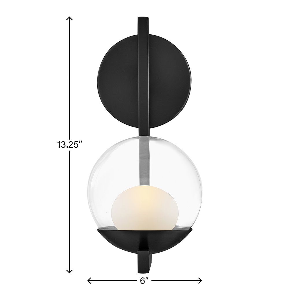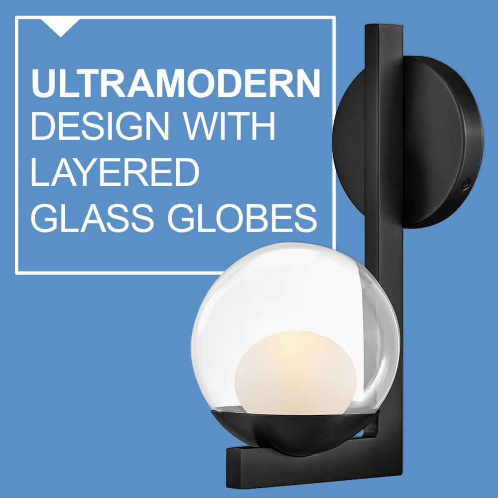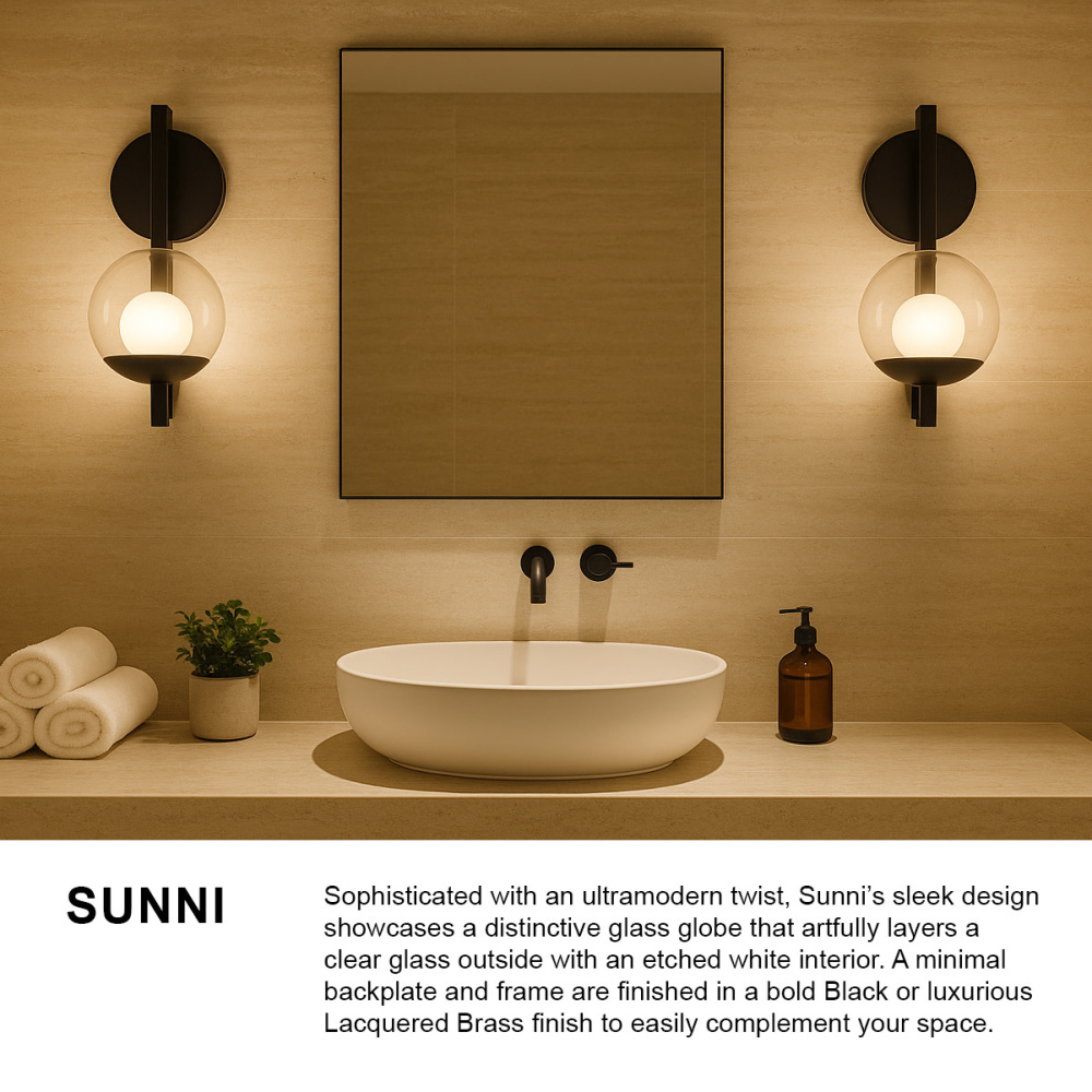 Sophisticated with an ultramodern twist, Sunni’s sleek design showcases a distinctive glass globe that artfully layers a clear glass outside with an etched white interior. A minimal backplate and frame are finished in a bold Black or luxurious Lacquered Brass finish to easily complement your space.
