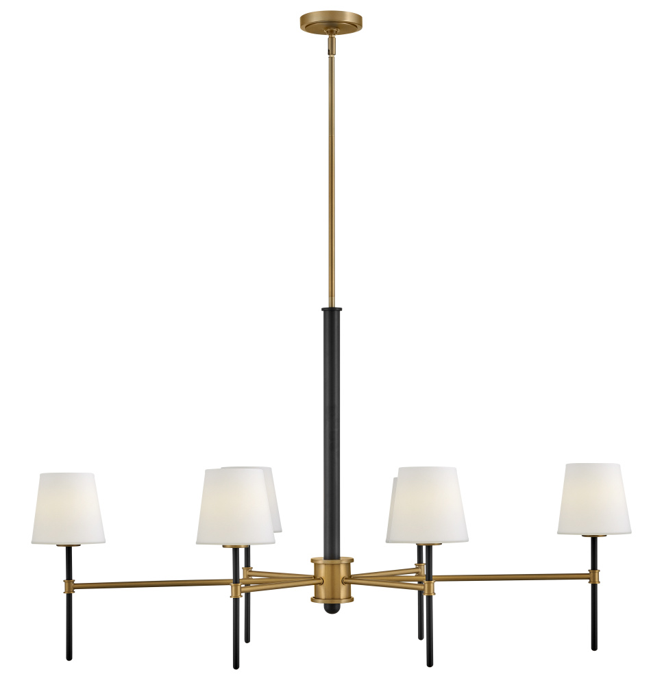 Saunders boasts a striking yet effortless appeal, blending traditional elements with captivating, mid-century modern details. A spoked silhouette and decorative stem holders are finished in Black and Lacquered Brass, paired with blown, etched opal glass shades.