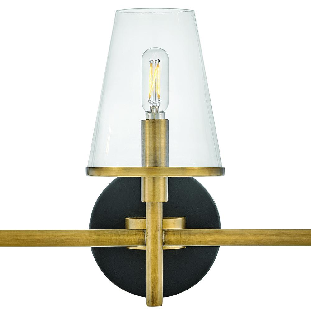Marten has a clean, crisp look that brings striking transitional elements to any décor style. Clear glass shades have a Heritage Brass rim, perfectly complementing the Black back plate to tie the aesthetic together. The clean lines provide the satisfaction of balanced symmetry while giving off ample light.