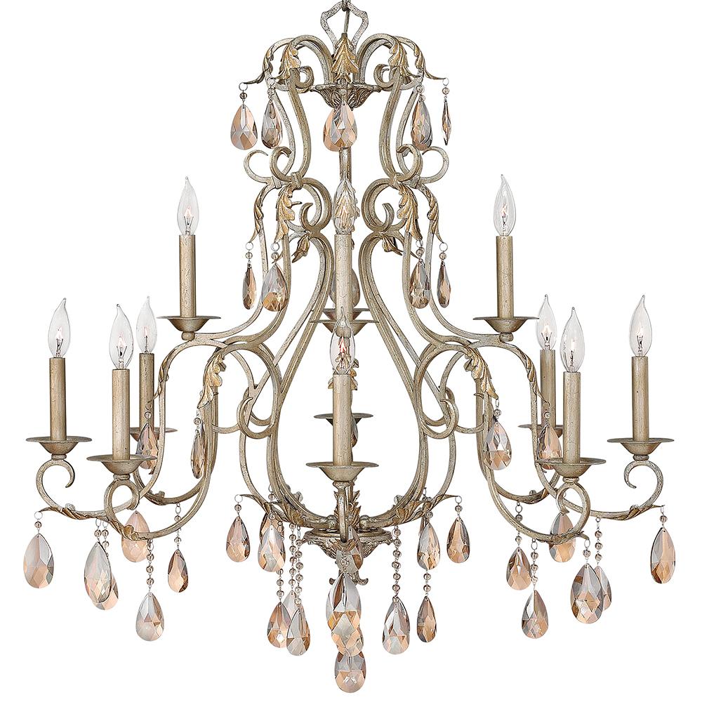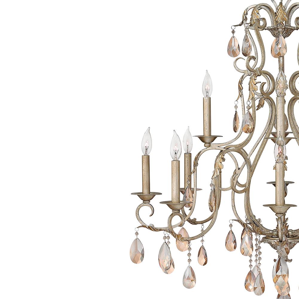Carlton's elegant petite candelabra iron design, finished in authentic Silver Leaf, makes a sophisticated statement with luxurious amber pearl crystals, optional translucent organza shade and ornate details.
