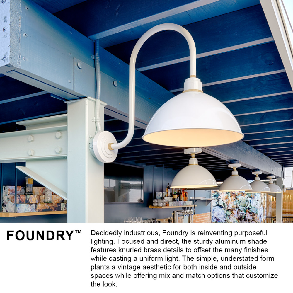 Decidedly industrious, Foundry reinvents purposeful lighting. Focused and direct, the sturdy aluminum shade features knurled brass details to offset a variety of finish options while casting a uniform light. The simple, understated form plants a vintage aesthetic for both inside and outside spaces while offering mix and match options that customize the look.