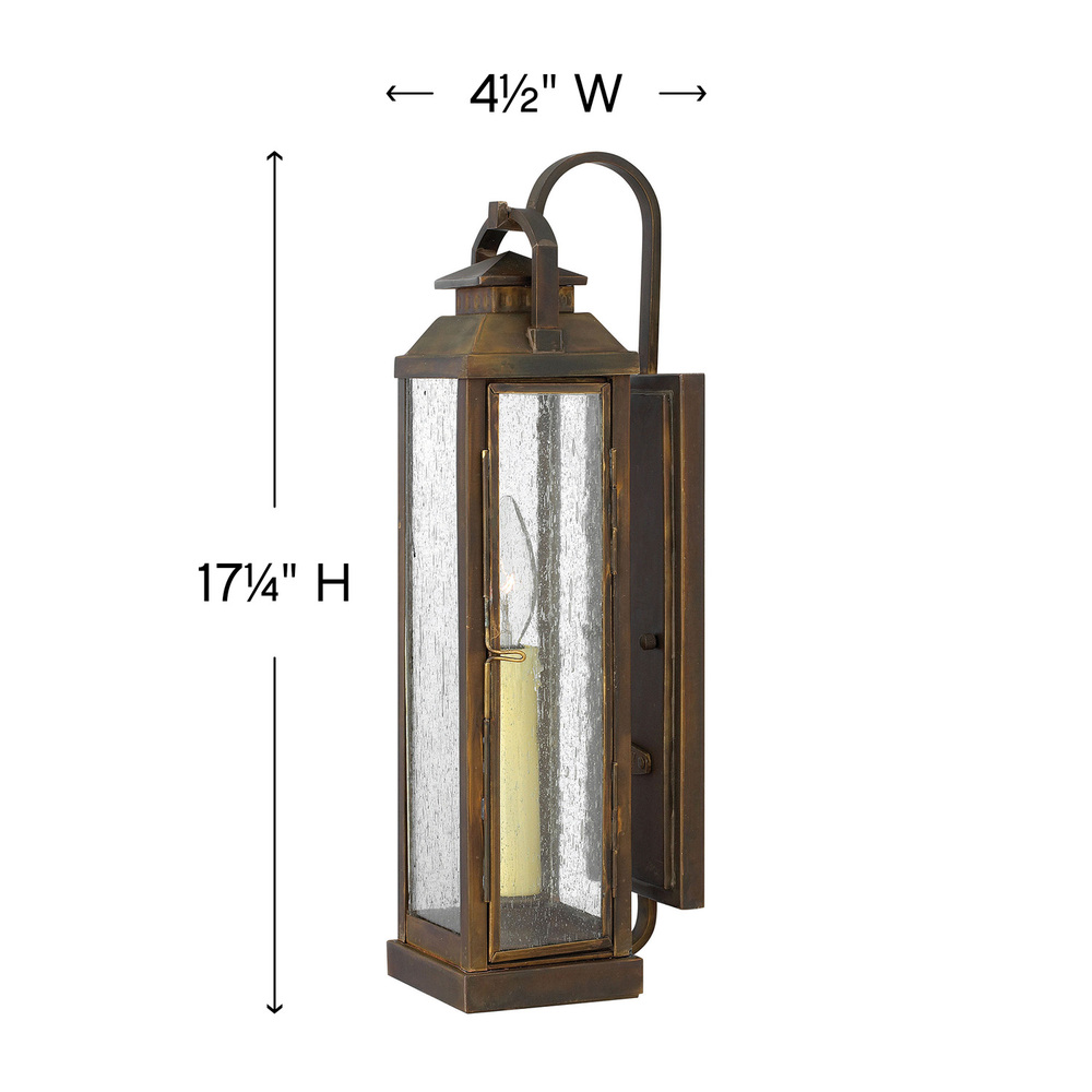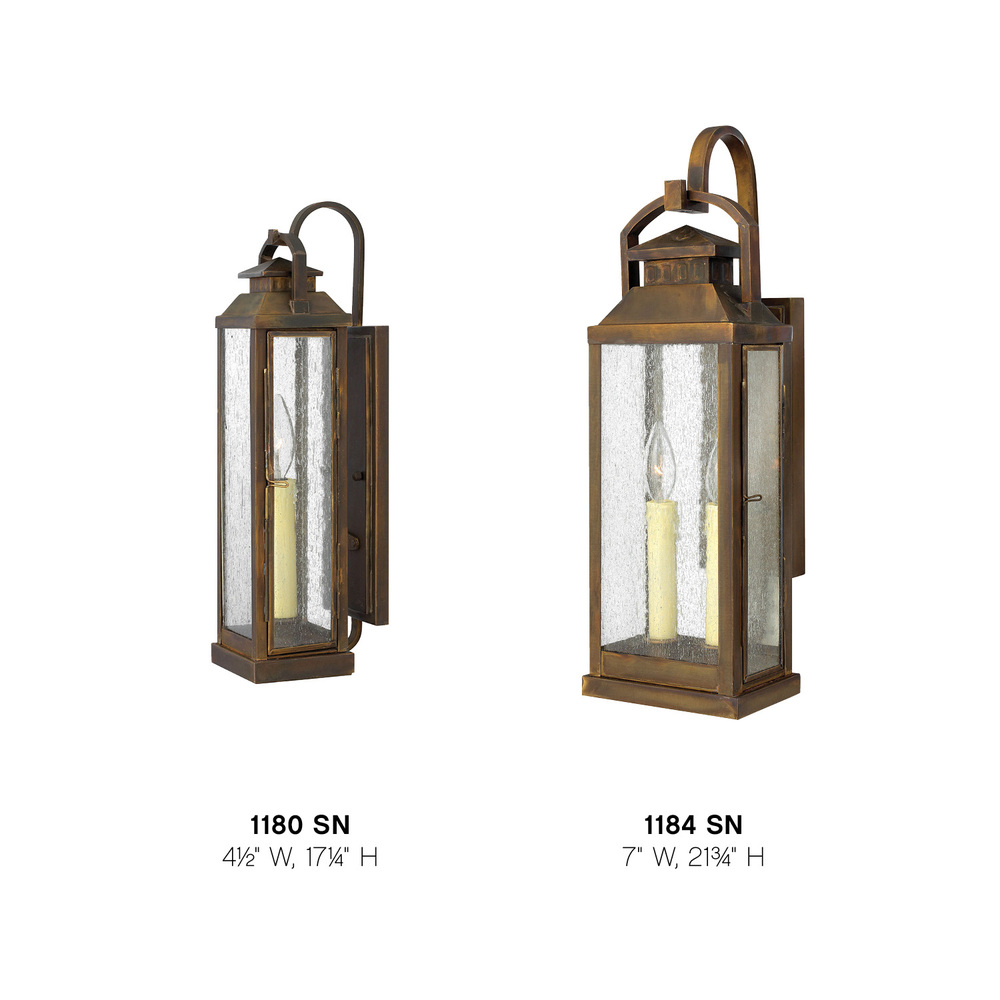 Revere is a traditional coach lantern in solid brass with clear seedy glass panels. The glass faux candle sleeves and classic candelabra lamping complete the authentic appearance.