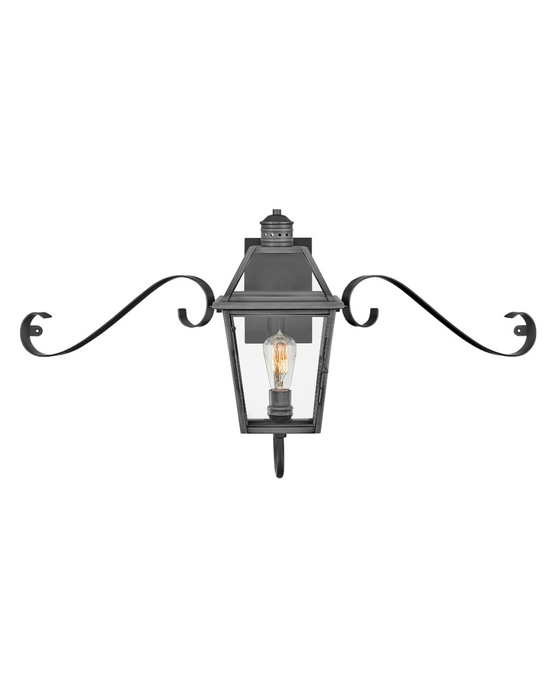 Handcrafted of solid brass, Nouvelle's construction evokes timeless vigor enhancing the appearance of a range of façades, from French Traditional to Modern. Nouvelle’s Blackened Brass cage stands out among its slightly tapered, four-sided glass panels to reinforce its simple charm.