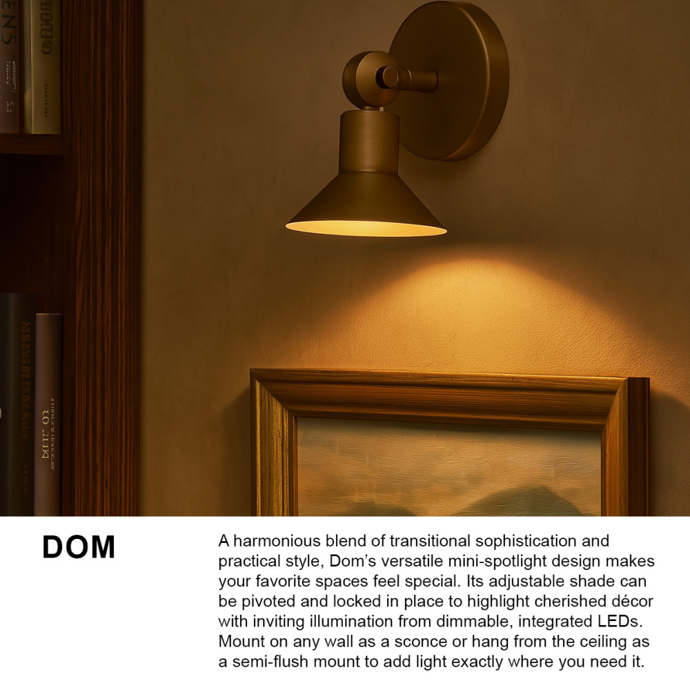 A harmonious blend of transitional sophistication and practical style, Dom’s versatile mini-spotlight design makes your favorite spaces feel special. Its adjustable shade can be pivoted and locked in place to highlight cherished décor with inviting illumination from dimmable, integrated LEDs. Mount on any wall as a sconce or hang from the ceiling as a semi-flush mount to add light exactly where you need it.