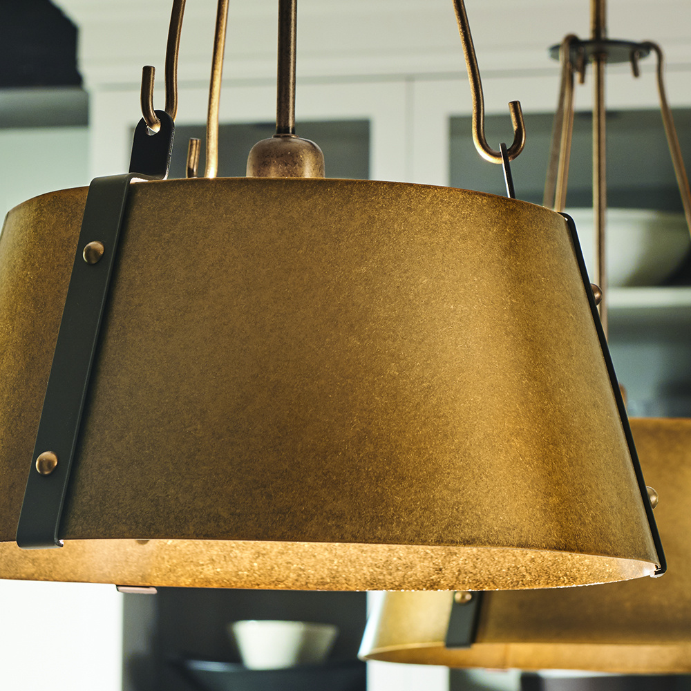 The Cartwright pendant collection captures a modern farmhouse aesthetic with its minimalist silhouette enriched by exquisite details and rich finishes. Contrasting straps are enhanced by bold rivets while robust hooks add a masculine elegance.