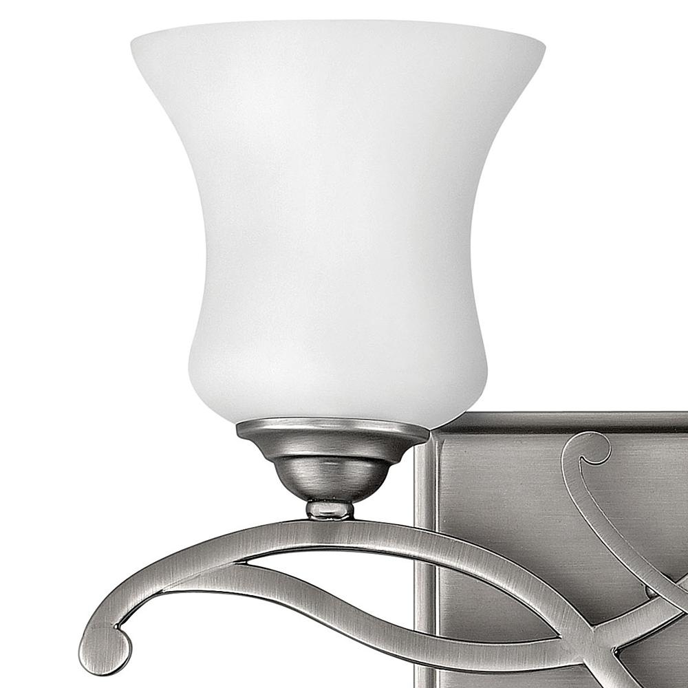 Brooke's updated traditional look features a minimalist forged scroll design in Antique Nickel and Olde Bronze that elegantly complements its etched opal glass.