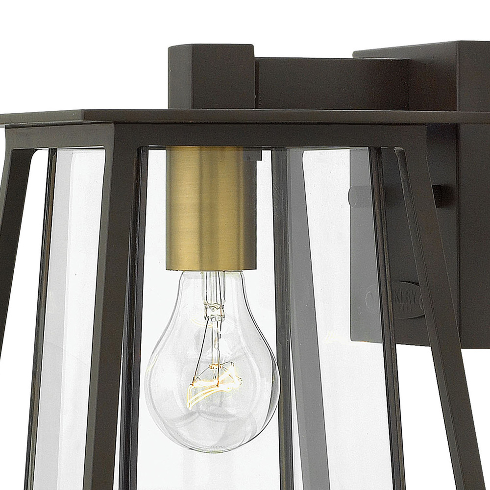 Walker has roots in the American West with its large scale, strong angular lines and no-nonsense style. The sturdy aluminum and brass construction features a two-tone finish, adding a transitional flair to its minimalist shape. A welded outer form frames an inner clear, bound glass shade. At home on the range, in a mountain cabin or creating a mid-century statement, this flexible style complements many façades.