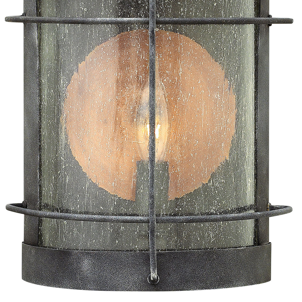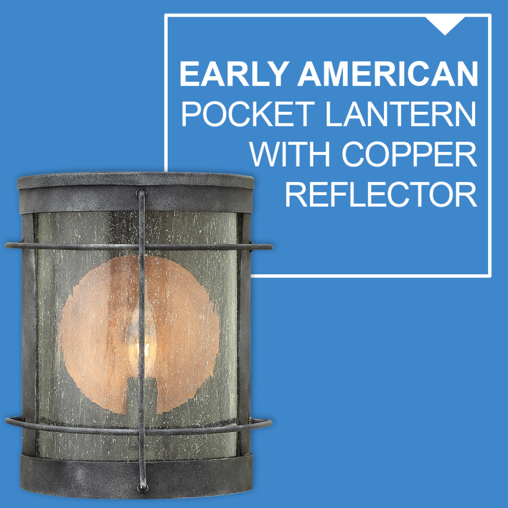 Newport is an early American classic pocket lantern featuring an optional copper reflector. Constructed in aluminum with the same quality as the traditional wharf light that served as its inspiration, the wire cage in Aged Zinc also features authentic rivet details and clear seedy glass to shield the light source.