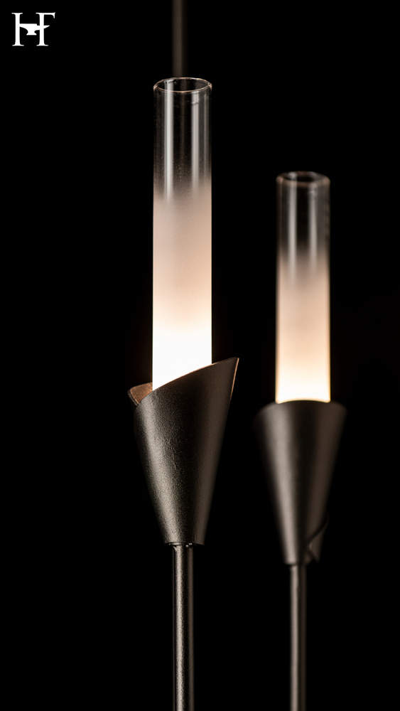 It is easy to see at first glance that designer Paul Marr Hilliard was inspired by the botanical nature of the lily. Each "tige" of the Lilium reaches upward toward its beautifully forged and shaped receptacle that holds a tall gradient-frosted glass cylinder that houses the light. The balance of the four vertical "stems" and its forged metal band give it the perfect shape and scale for multiple uses in a variety of spaces.