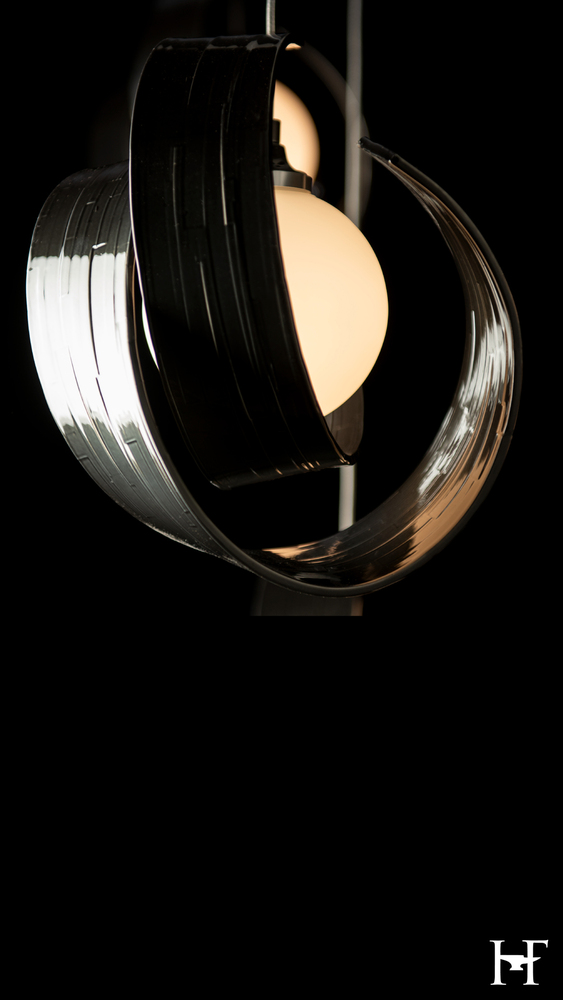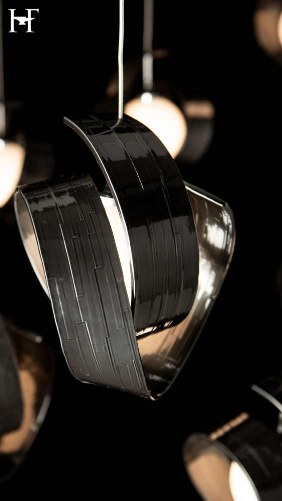 Each Riza curl is hammered and shaped to create this stunning display. The mobile platform minimizes the canopy, while the delicate metal tubes guide the cables providing not just great breadth, but also a highly-adjustable fixture. Riza elements are artfully balanced for a unique feeling of both depth and whimsy.