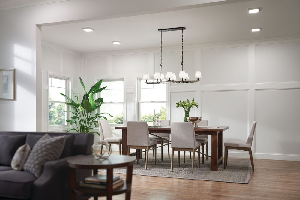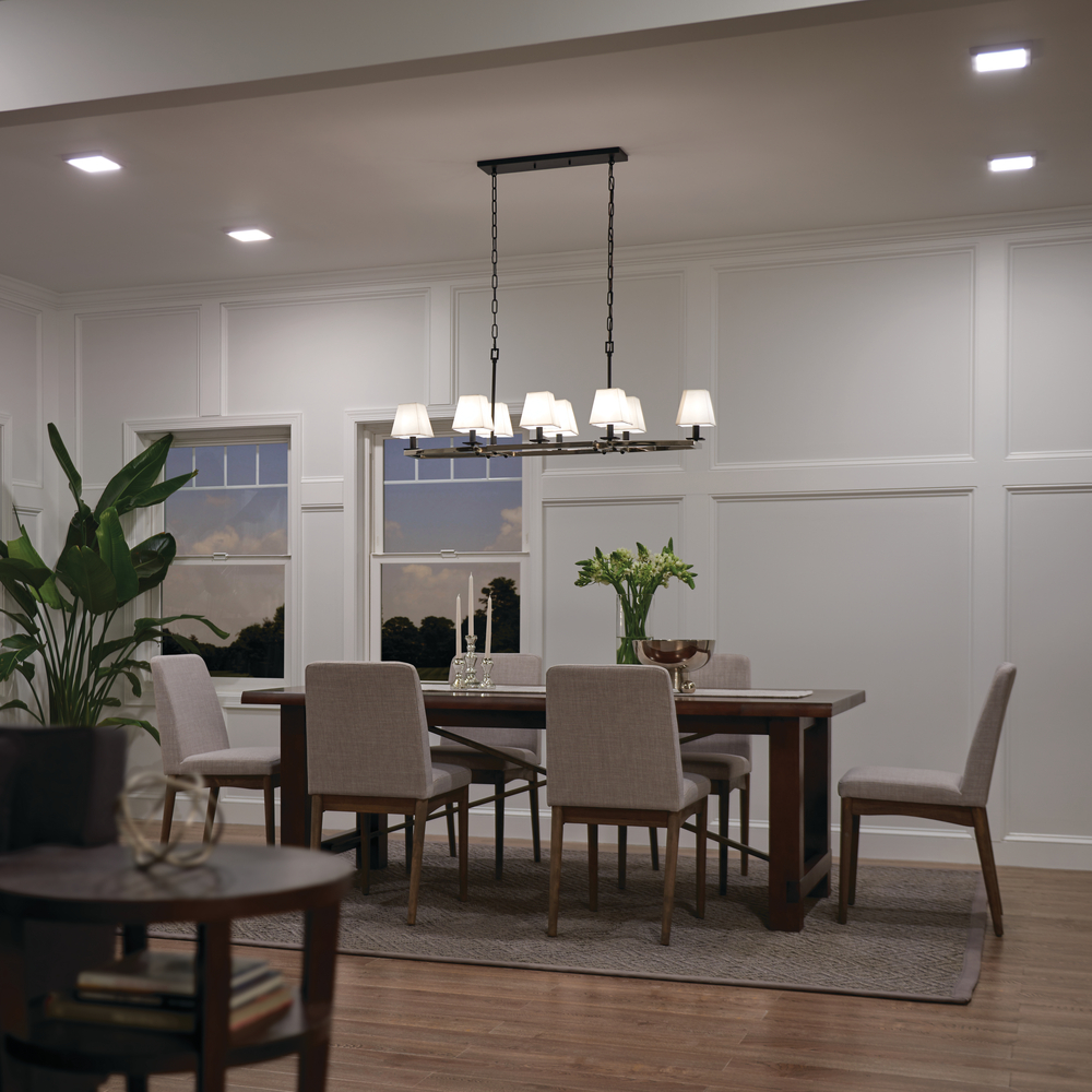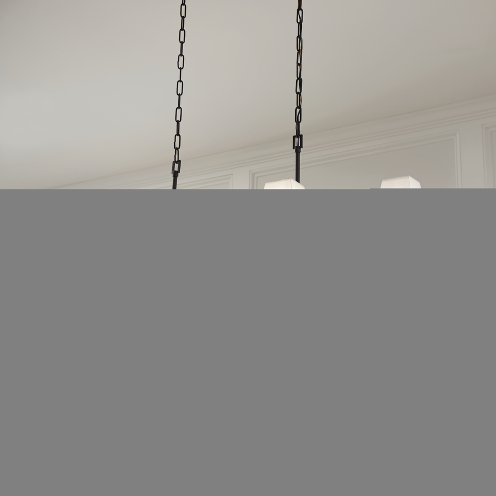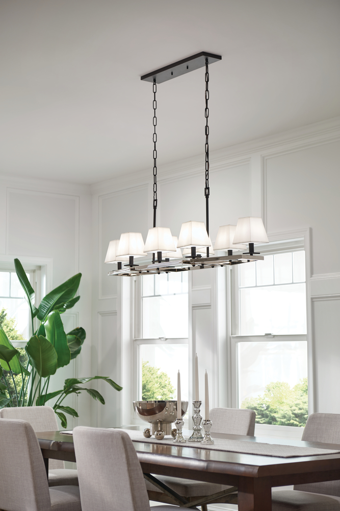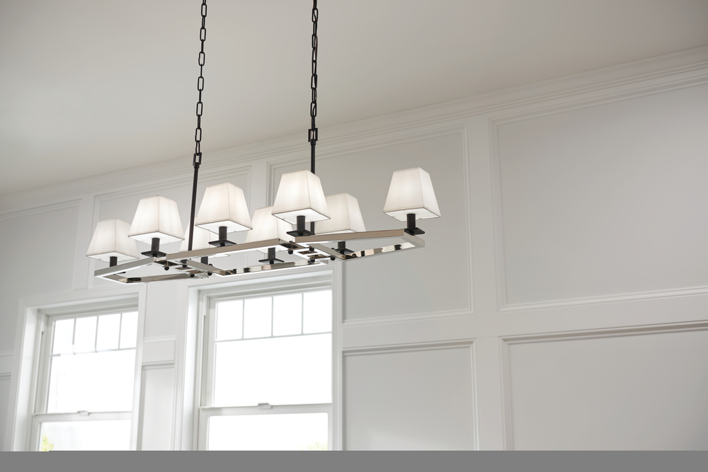 Featuring square lines and cascading chain accents, the Dancar™ 8-light linear chandelier with Polished Nickel finish flows nicely with soft contemporary spaces. The Dancar's square, white microfiber shades, and satin etched diffuser glass provide a warm and relaxed tone to any room.