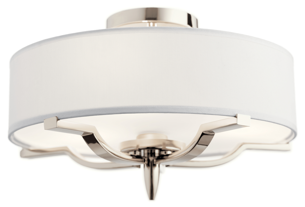 This Kinsey 3 light flush mount features a shiny Polished Nickel finish accented with a matte Satin Nickel for added visual effect. The soft white linen shades sit atop etched glass diffusers for a finished and refined look.