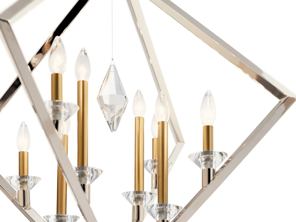 Glamorous in shape and style, the Layan 8 light foyer pendant is a gem that lights up a space. The Polished Nickel and Classic Bronze finish combination shine with style, while the decorative crystal pendant sparkles.