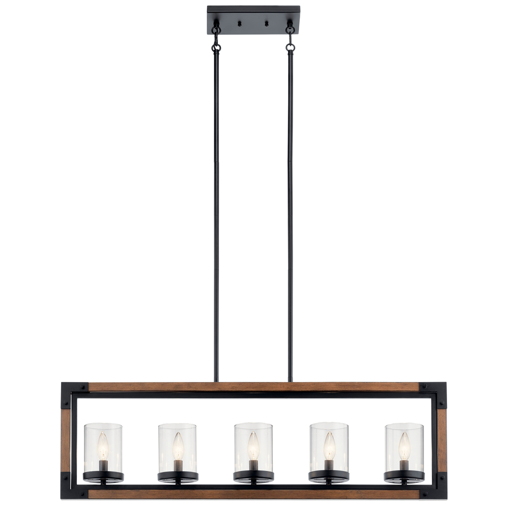 Warm and welcoming tones give the Marimount 5 light linear chandelier a vintage feel. The wood-look structure offers weathered style in a rich Auburn finish, framed in Black metal. Clear glass shades assure the light shines through.