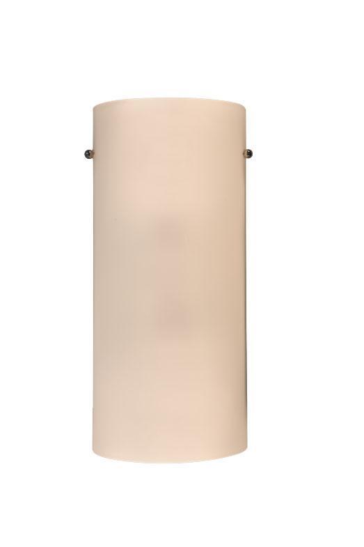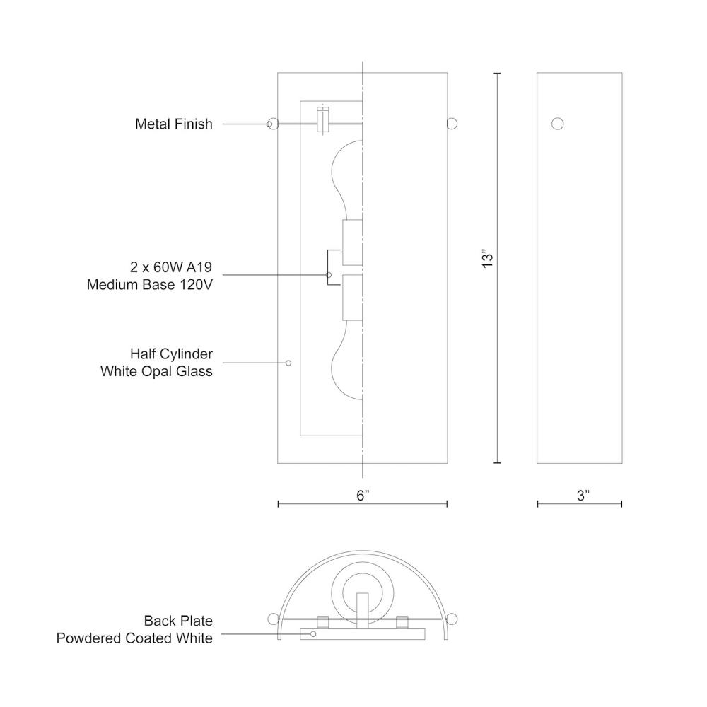 Two lamp wall sconce with half cylinder shaped white opal glass. Metal details in brushed nickel and chrome finish, both decorative nut finish options included within fixture.