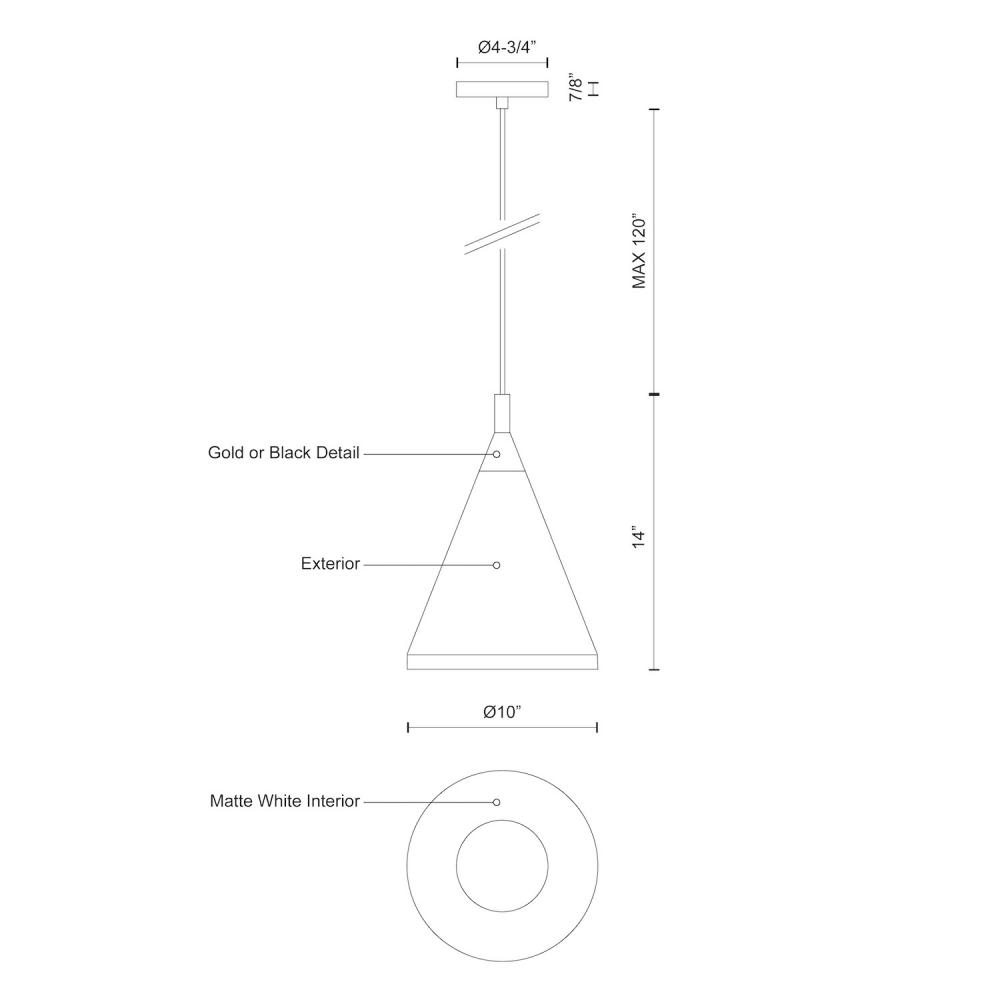 Single lamp pendant with conical aluminum shade with fine powder-coated or plated finishes with contrasting finial. Exterior shade colors are black or white with gold detail or brushed nickel with black detail. Suspended by cloth cable. Available in 3 sizes.