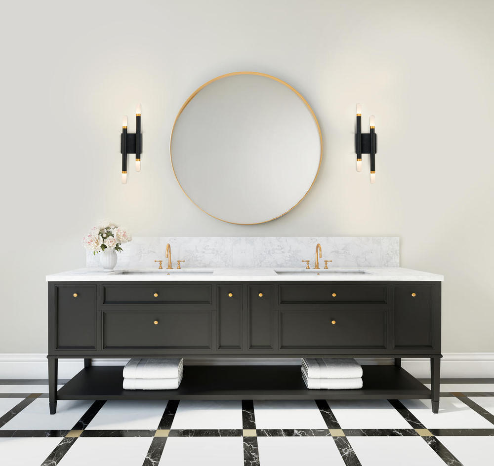 Cylindrical aluminum arms extend from square wall mount. Finely textured powder-coat finish. Tapered round translucent diffusers. Plated-brushed gold accent rings. Up and down light. Custom options available.