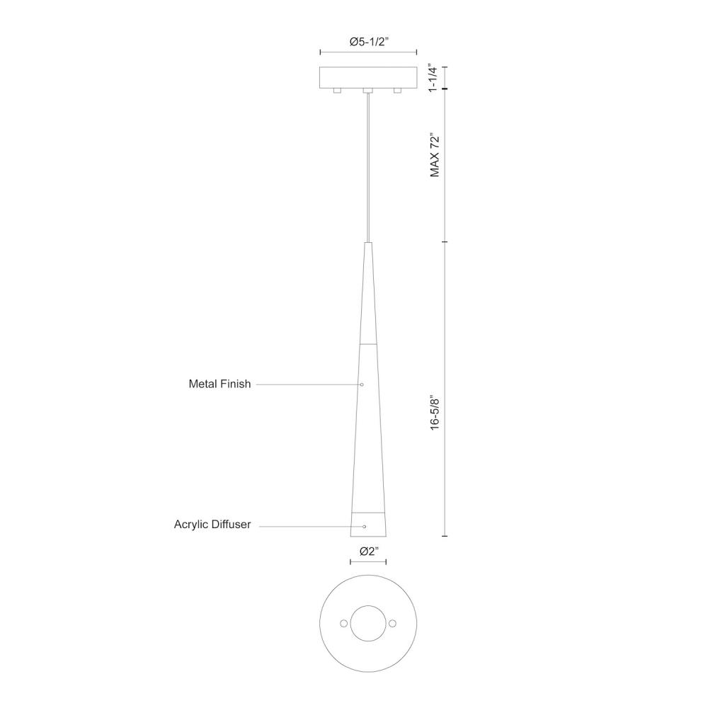 Single LED lamp pendant, slender cone-shaped cylinder with acrylic top and bottom of cone which lights up on both ends. Equipped with our powerful 12V AC LED technology, 5.5W, fully dimmable and is adjustable to a maximum length of 72".Chrome finish: available in a variety of multi-pendant options see series for family details. Black and Vintage Brass finish: build your own configuration, choose how many pendants and choose the canopy shape and size accordingly.