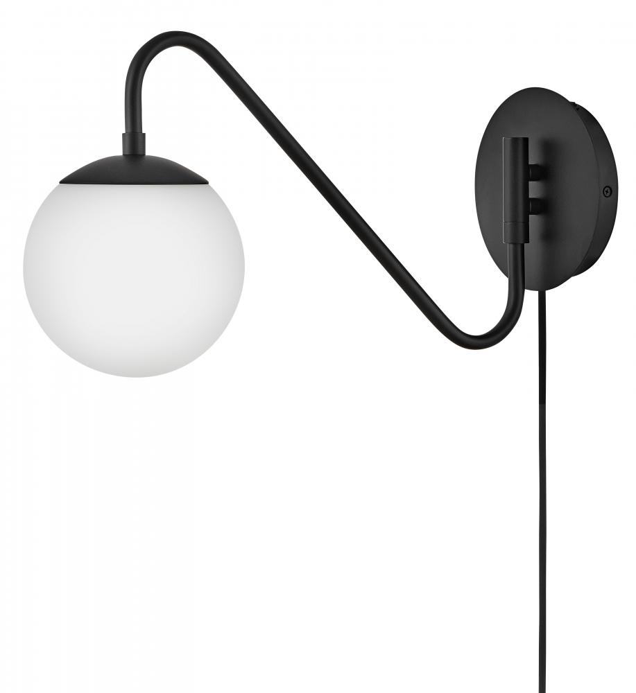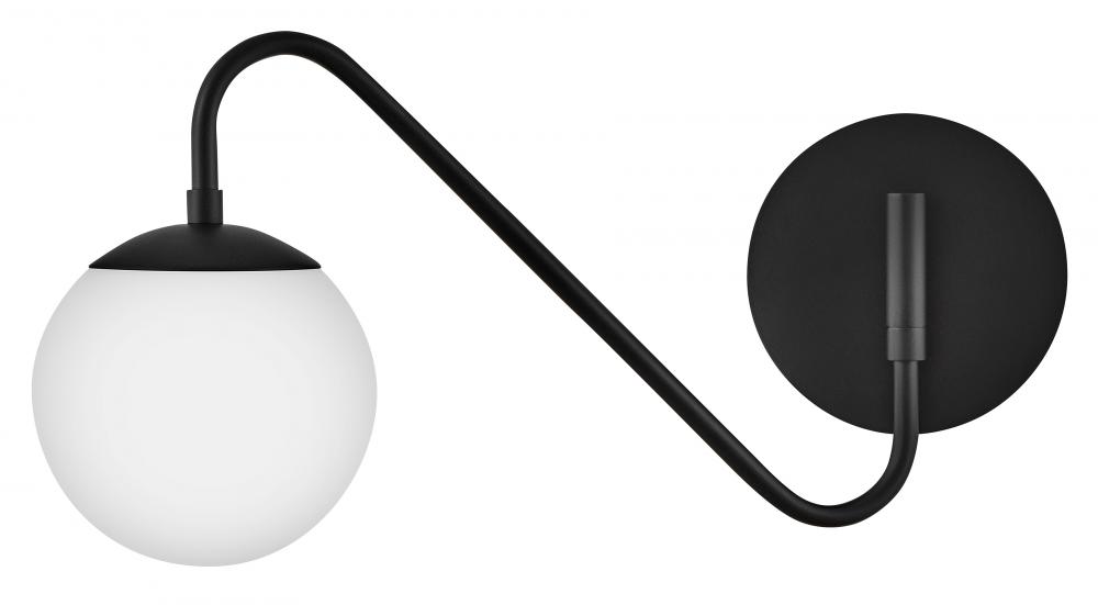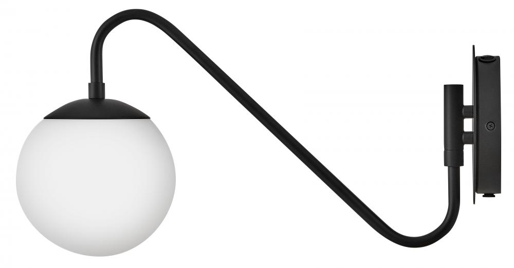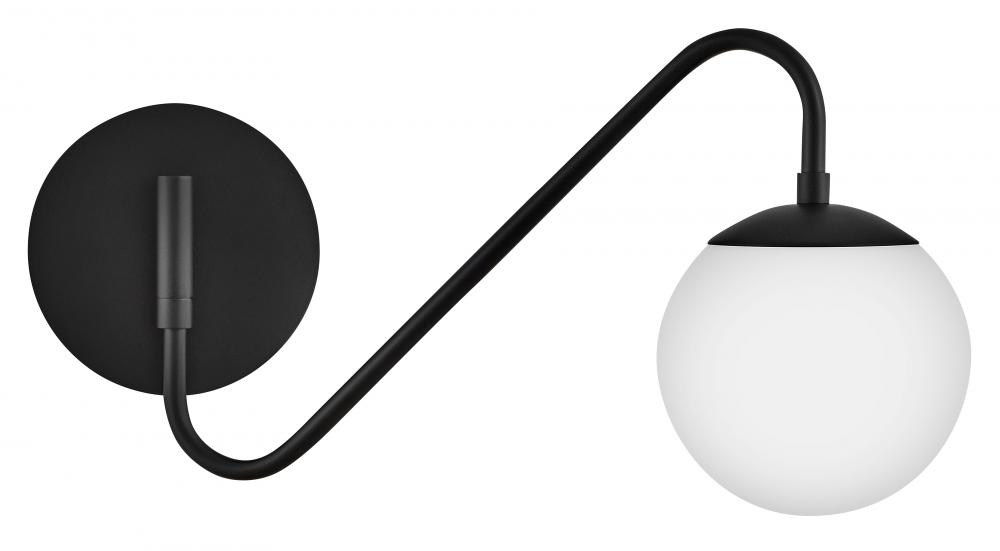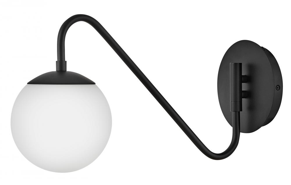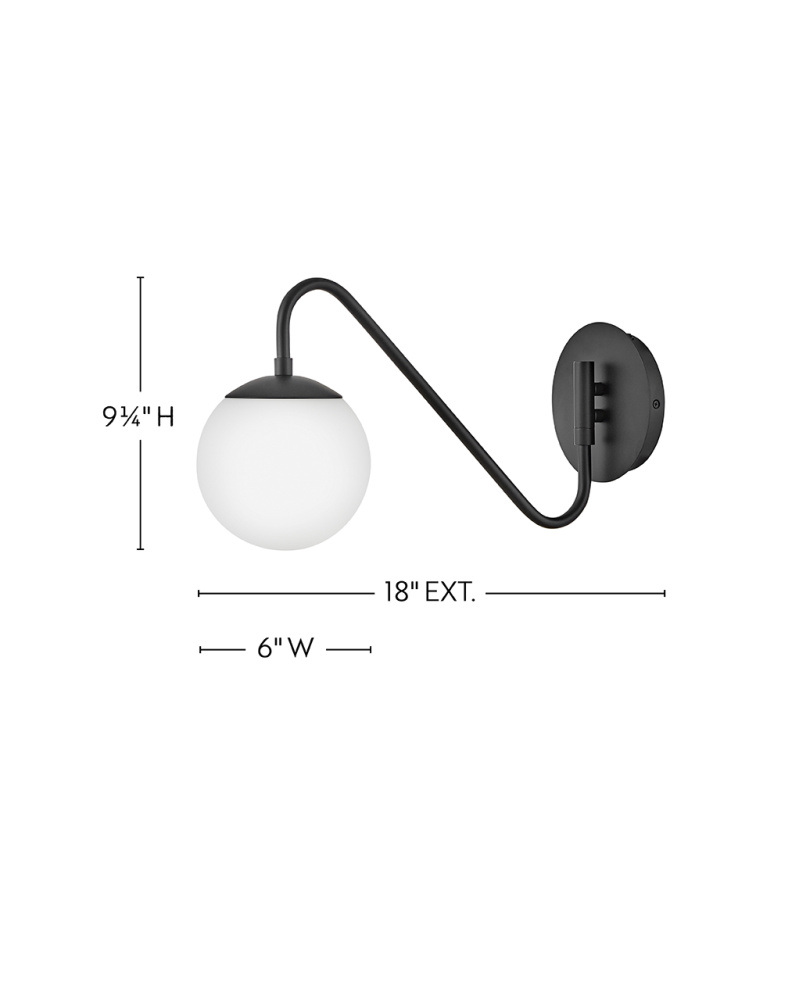 Fun and functional meets mid-century modern with Dottie, a single light sconce that seamlessly blends high style and practicality. A meandering arm with an articulating design extends from thebackplate, delicately gripping the etched opal globe to emit a warm, enveloping glow. It’s the perfect task light for next to the bed or over a kitchen counter.