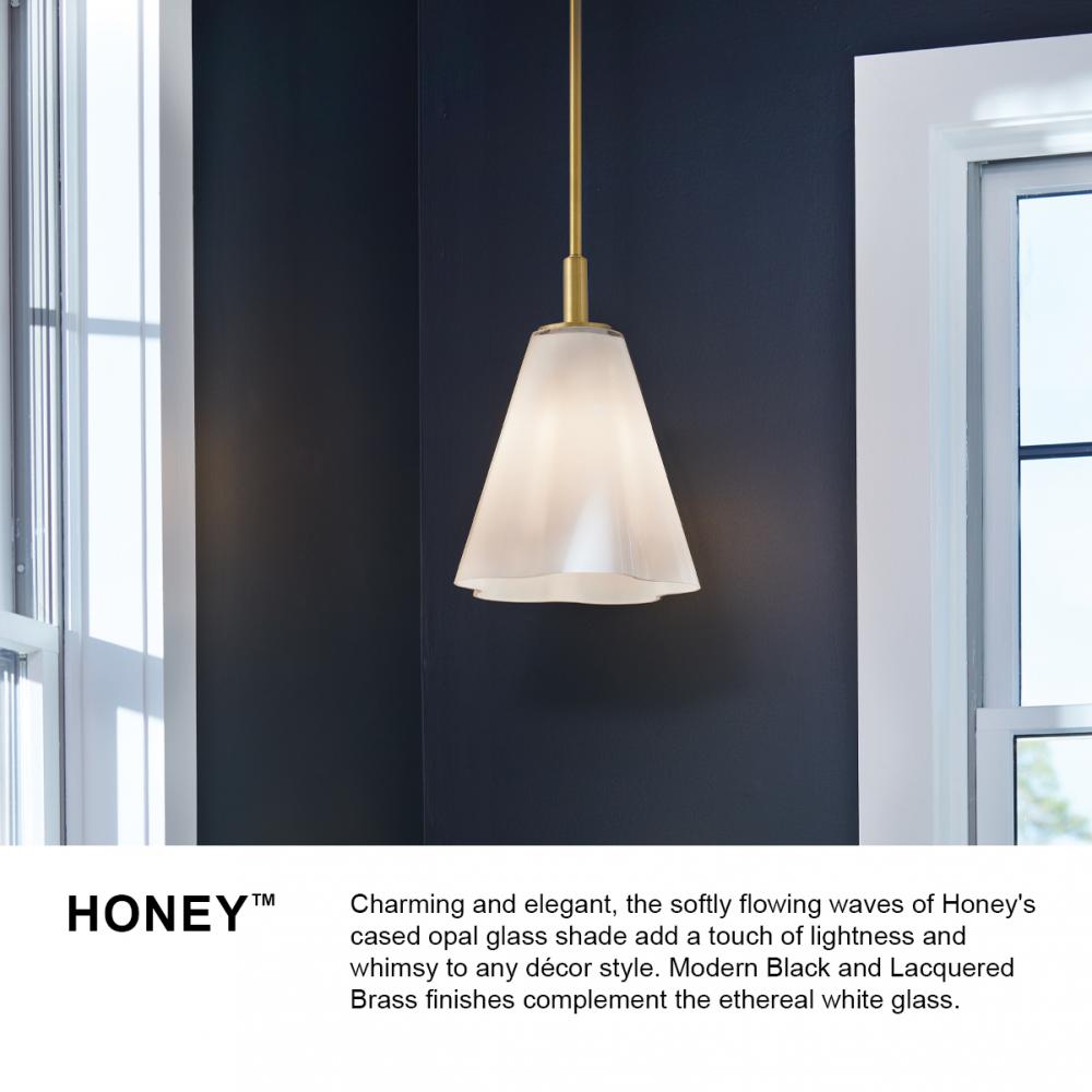 Charming and elegant, the softly flowing waves of Honey’s cased opal glass shades add a touch of lightness and whimsy to any décor style. Inspired by gold leaf, a modern Distressed Brass finish complements the ethereal white glass.