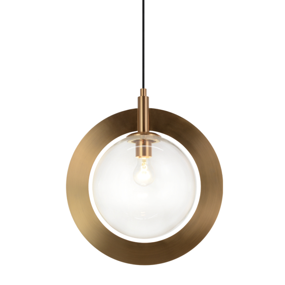 A stunning yet simple pendant designed with circular elements. Astro features Clear or Opal Glass, surrounded by a bold metal ring. Available in 2 finishes: Aged Gold Brass and Black.