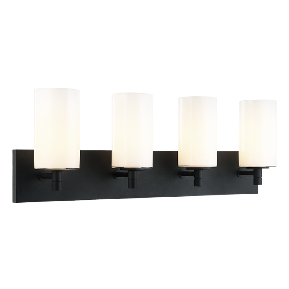 The Candela series is a transitional style vanity pillar shaped glass. Three finishes, Aged Gold Brass, Chrome, Matte Black in either Clear or Opal glass shade.