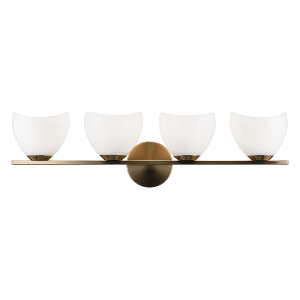 Uptowne is a dazzling family with distinctive curved opal glass. Available in Aged Gold Brass or Black.