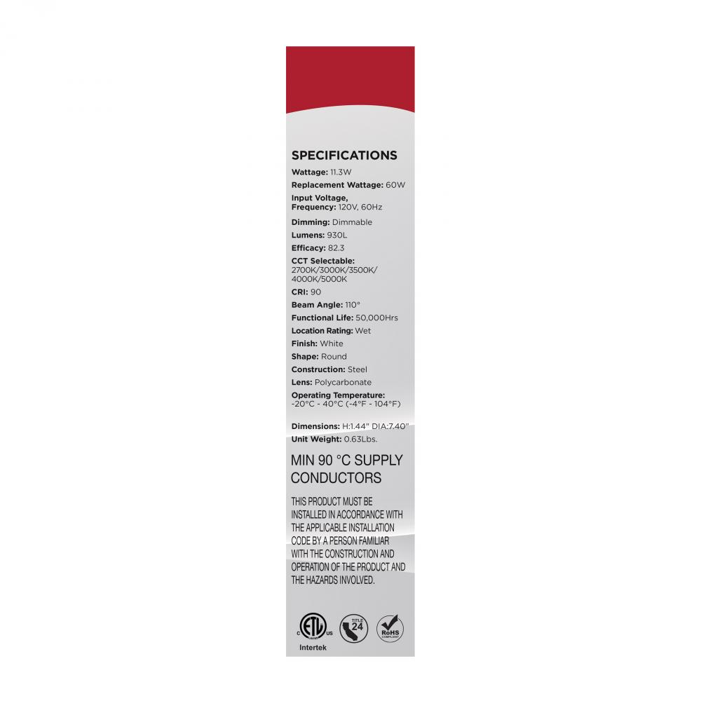 Bring style and performance to your space with SATCO NUVO's 62-1801R1, 7" CCT Selectable Disk Light in a white finish. Delivering 11.3 watts of energy-efficient illumination, this sleek fixture features five selectable color temperatures (2700K–5