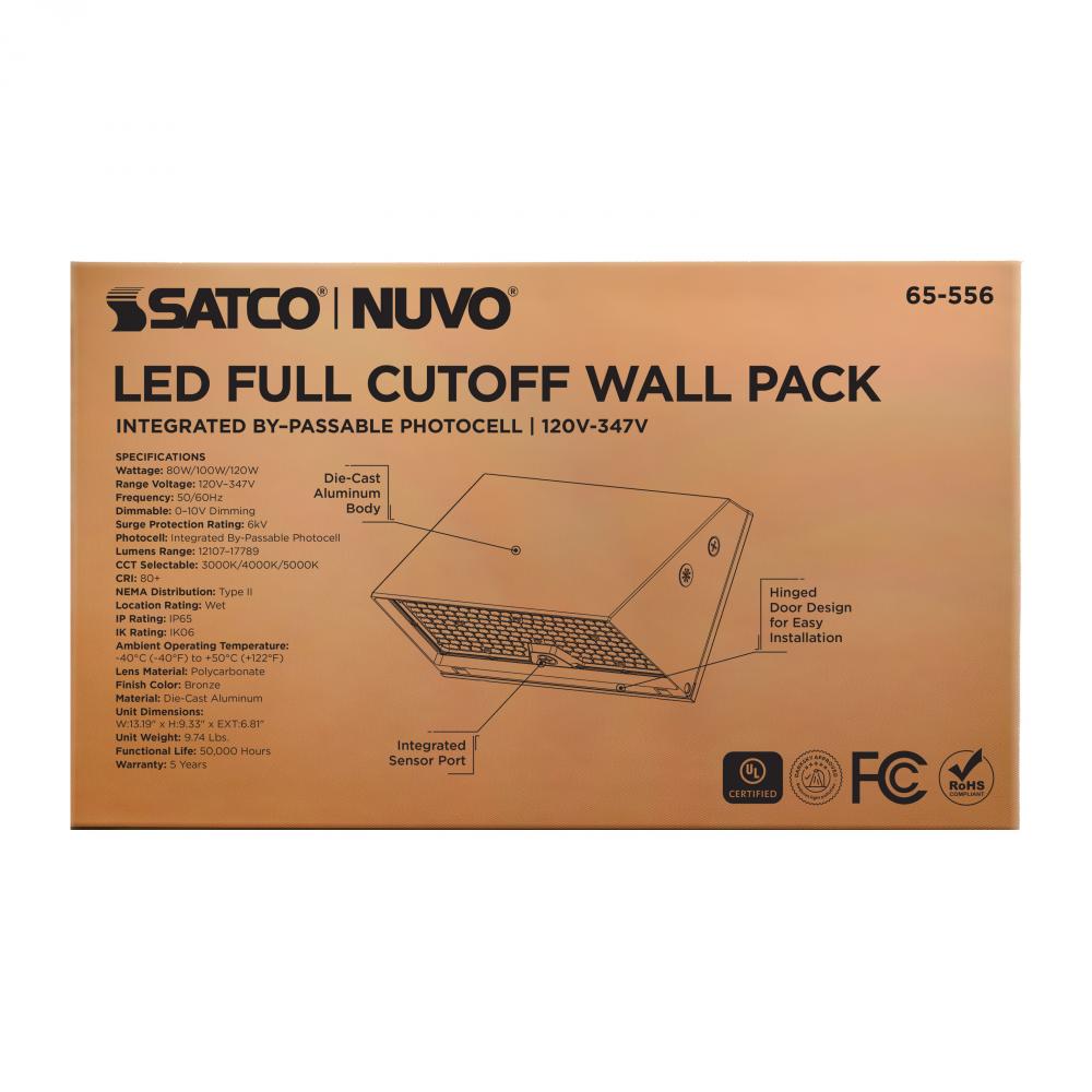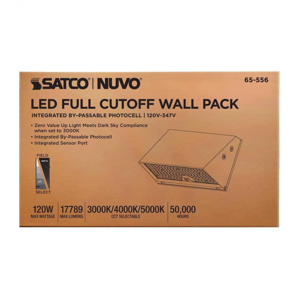Illuminate outdoor spaces with SATCO NUVO's 65-556 architecturally styled LED Full Cutoff Wall Pack. Operating on 120-347V with zero up light, this fixture features wattage selectability of 80W, 100W, and 120W, delivering a maximum output of 17,789 lum