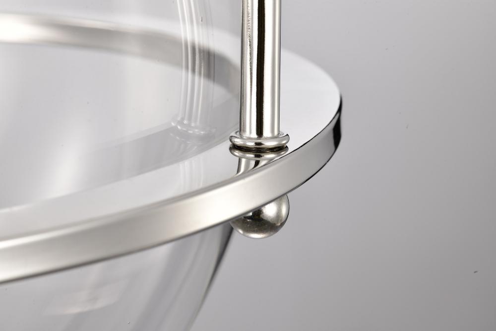 Elegant, transitional allure completes the Amado 60-7819 medium pendant with it's unassuming style. The sleekness of polished nickel brings graceful refinement and the clear glass bowl delicately showcases the light and is encompassed in graceful lines