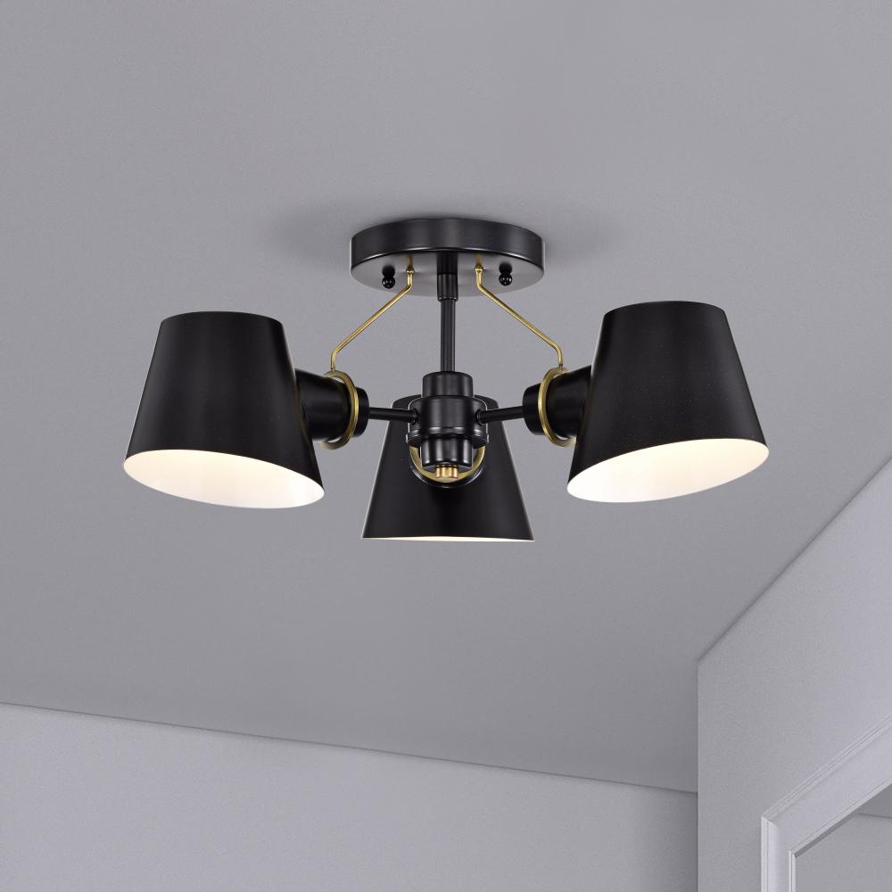 The Baxter 60-7384 semi-flush mount does not disappoint, with its modern design and impressionable style. The black shades are finely cut at an angle and feature a white interior to maximize the light output. The lustrous burnished brass stems attach from