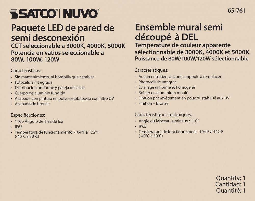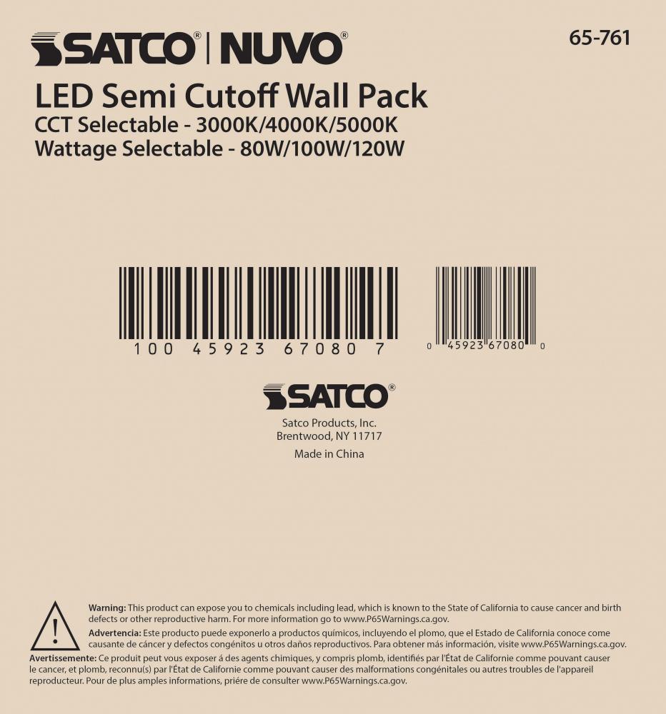 Introducing 65-761, SATCO NUVO's new CCT and Wattage selectable wall pack with integrated bypassable photocell. This cULus certified wall pack is offered in a semi-cutoff style with 80W/100W/120W wattage configurations, CCT selectable temperatures of 3