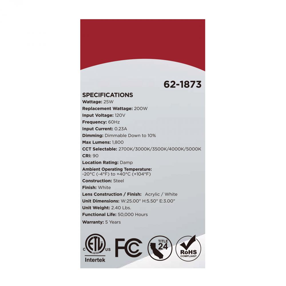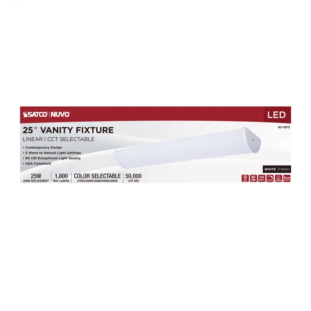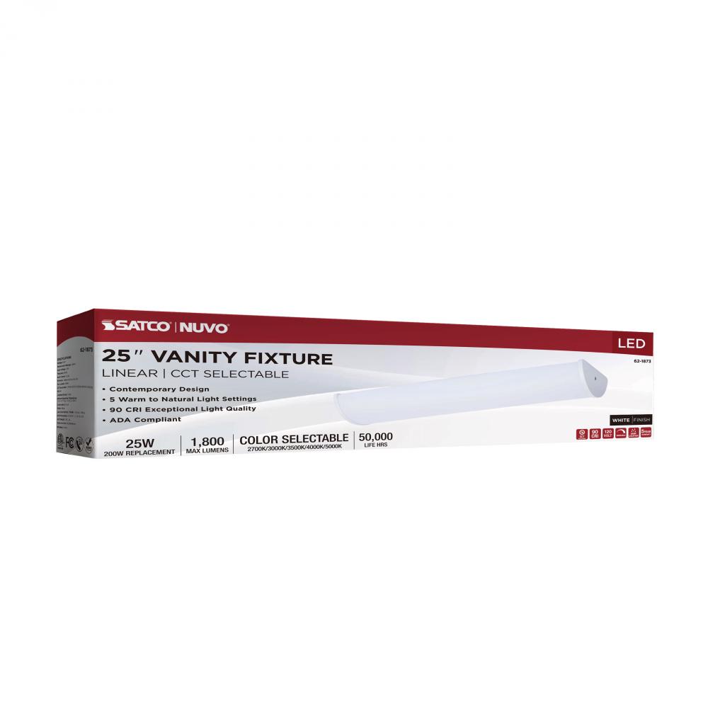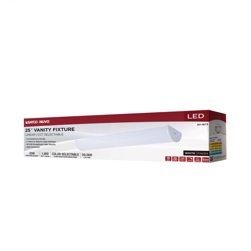 The SATCO NUVO 62-1873 Crispo 25-inch Vanity Fixture in All White features 5 CCT selectable technology (2700K–5000K) and 90 CRI illumination for vibrant color rendering. This 25-watt fixture replaces 200W incandescent lighting, providing energy-efficient
