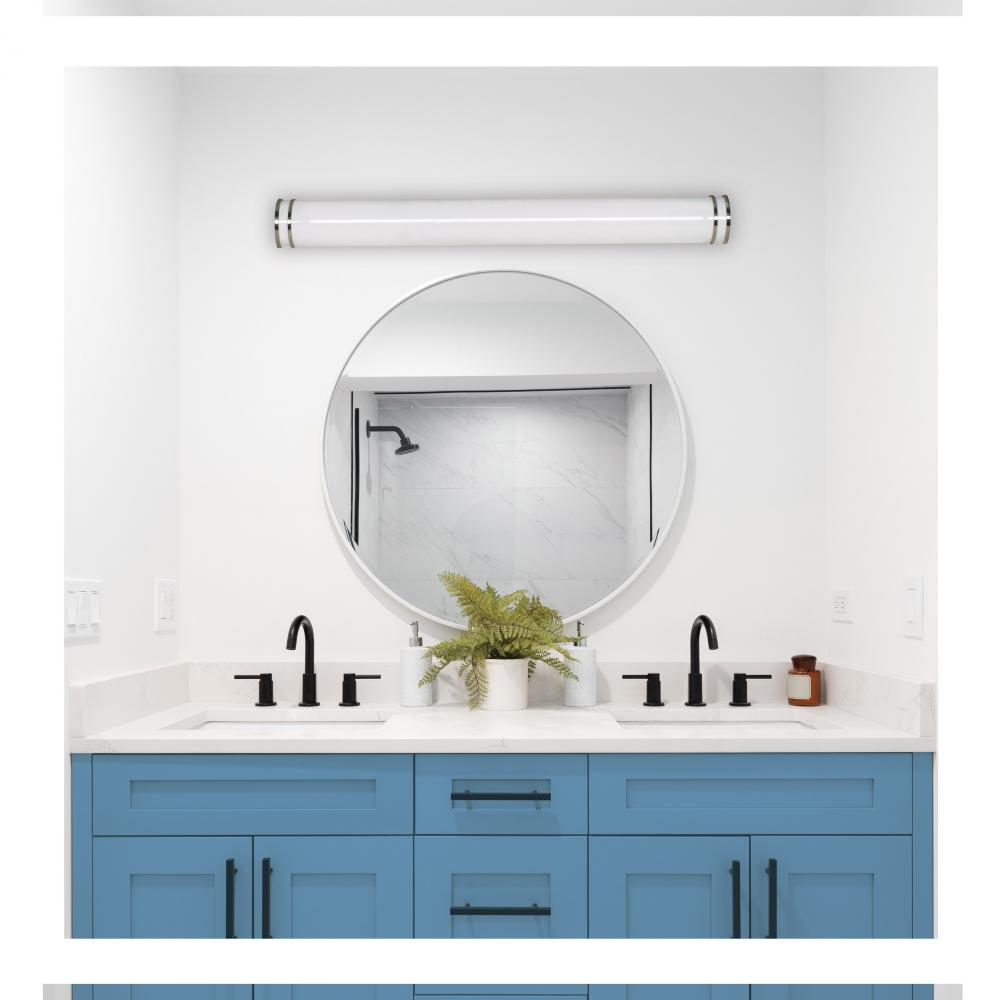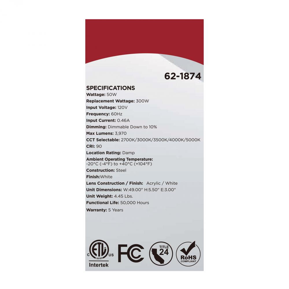 The SATCO NUVO 62-1874 Crispo 49-inch Vanity Fixture in All White combines modern design with 5 CCT selectable technology (2700K–5000K) and 90 CRI illumination for enhanced color rendering. This 50-watt fixture replaces 300W incandescent lighting, offeri