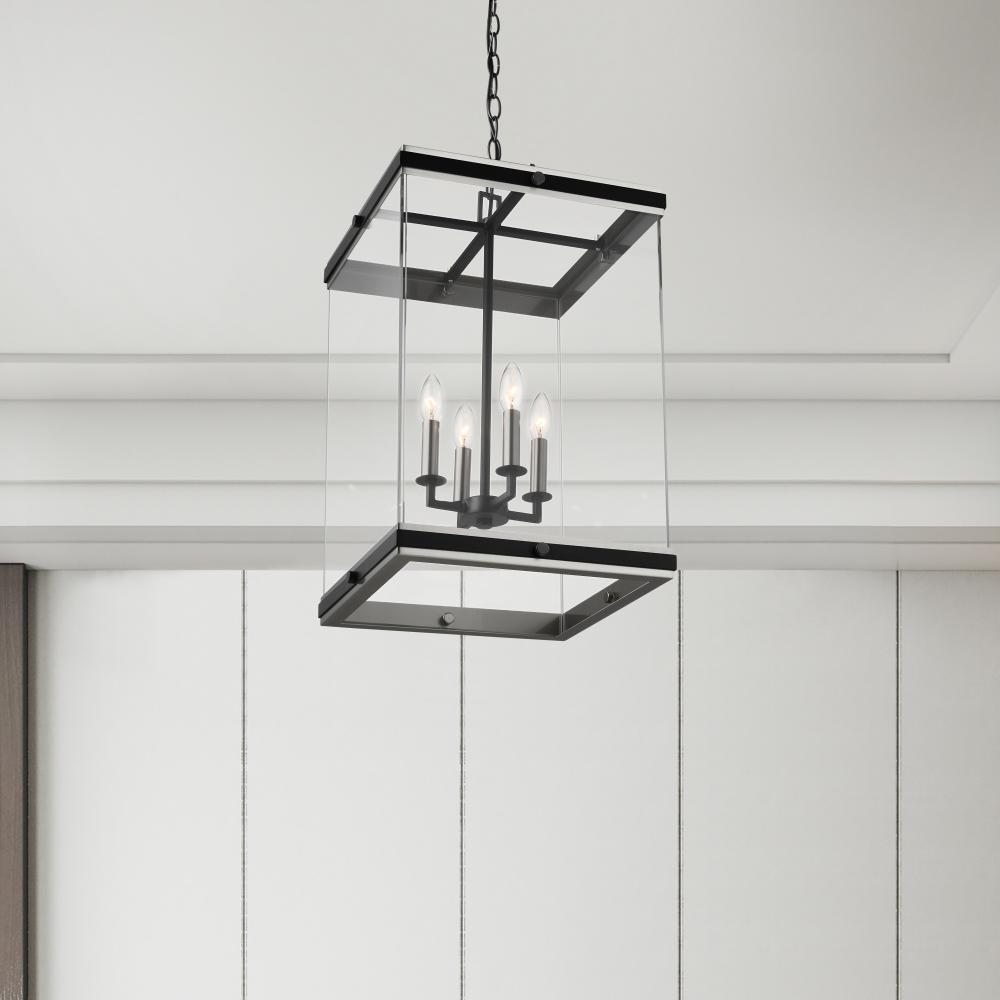 A combination of glass and metal comes together to create the stunning design of the Crossroad foyer pendant. The square, clear glass panels showcase the bulbs. The sockets and base are finished in brushed nickel to contrast beautifully with the matte blac